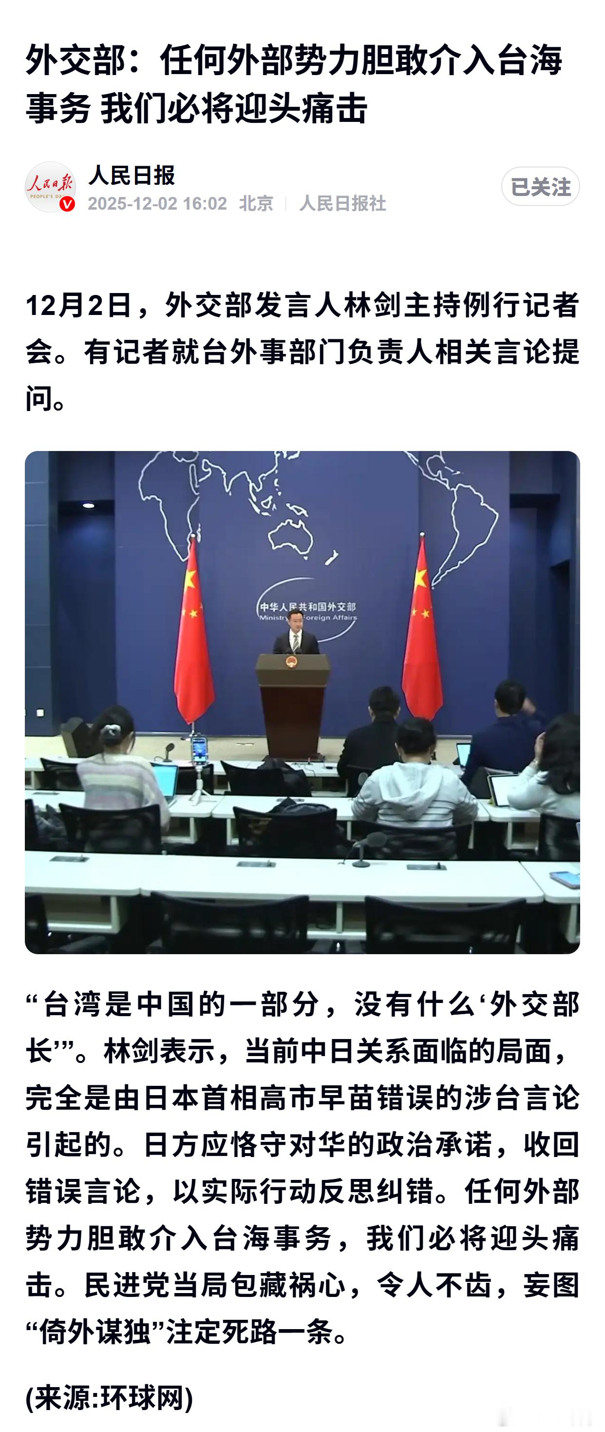 外交部:任何外部势力胆敢介入台海事务 我们必将迎头痛击