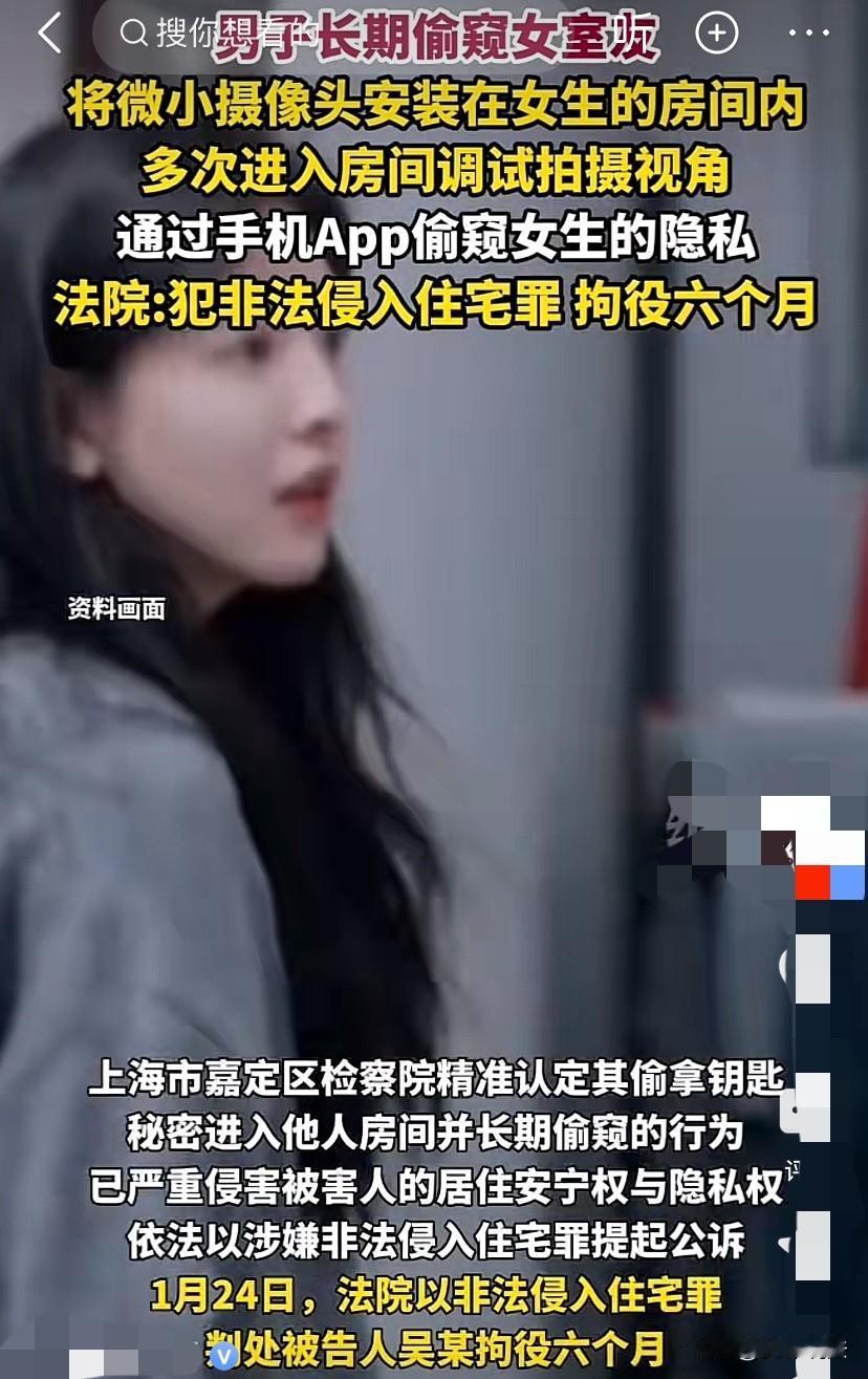 上海嘉定,男子与一女子合租了一套两室一厅的房子,期间趁对方不在家时,偷偷用对方藏在鞋盒里的钥匙,进入对方的房间,安装了个摄像头,偷窥对方。一个多月后,男子觉得不够刺激,又将摄像头取出,安装到两人共用的卫生间里,结果次日一早就被对方发现。男子最终悲剧了! 据悉,男子吴某与女子张某合租了一套两室一厅的房子。 吴某与张某两人各自一个卧室,共同使用客厅、厨房、卫生间及阳台等区域。 没过多久,吴某便起了歪心思,在发现张某平时将自己卧室的备用钥匙藏在客厅一盒子内后,遂趁张某外出工作之际,用张某卧室的备用钥匙进入张某房间内,在张某房间内安装了一个微小摄像头。 随后,吴某便通过手机软件长时间偷看张某。 期间因不满意角度,吴某还曾多次潜入张某的房间内调试拍摄角度。 转眼1个月多月过去了,吴某觉得不够刺激,又趁张某不在家将摄像头从张某的房间内取出,安装到两人共用的卫生间内洗手台下面。 结果,哪曾想,次日一早,张某在卫生间洗漱时,恰巧看到了摄像头,并报了警。 张某报警后,警方认为吴某有作案的嫌疑,便将吴某传唤到派出所接受调查。 而在调查中,吴某也如实交代了自己的行为。 如何评价吴某的行为? 首先,《民法典》第1032条规定,自然人享有隐私权。任何组织或者个人不得以刺探、侵扰、泄露、公开等方式侵害他人的隐私权。隐私是自然人的私人生活安宁和不愿为他人知晓的私密空间、私密活动、私密信息。 吴某偷拍张某的行为,毋庸置疑已经侵犯了张某的隐私! 其次,《刑法》第245条规定,非法搜查他人身体、住宅,或者非法侵入他人住宅的,处3年以下有期徒刑或者拘役。 这里的住宅是指用于生活居住的相对隔绝的,具有供人饮食起居日常生活的基本条件的房屋或者房间,合租房中的单间也属于非法侵入住宅罪中的“住宅” 吴某不仅存在偷拍行为,还多次进入张某的卧室内进行偷拍,还构成了非法侵入住宅罪。 《刑法》第284条规定,非法使用窃听、窃照专用器材,造成严重后果的,处2年以下有期徒刑、拘役或者管制。 根据2014年12月23日国家工商行政管理总局、公安部、国家质量监督检验检疫总局发布的《禁止非法生产销售使用窃听窃照专用器材和“伪基站”设备的规定》,窃听专用器材,是指以伪装或者隐蔽方式使用,经公安机关依法进行技术检测后作出认定性结论,有以下情形之一的:(一)具有无线发射、接收语音信号功能的发射、接收器材;(二)微型语音信号拾取或者录制设备;(三)能够获取无线通信信息的电子接收器材;(四)利用搭接、感应等方式获取通讯线路信息的器材;(五)利用固体传声、光纤、微波、激光、红外线等技术获取语音信息的器材;(六)可遥控语音接收器件或者电子设备中的语音接收功能,获取相关语音信息,且无明显提示的器材(含软件);(七)其他具有窃听功能的器材; 窃照专用器材,是指以伪装或者隐蔽方式使用,经公安机关依法进行技术检测后作出认定性结论,有以下情形之一的:(一)具有无线发射功能的照相、摄像器材;(二)微型针孔式摄像装置以及使用微型针孔式摄像装置的照相、摄像器材;(三)取消正常取景器和回放显示器的微小相机和摄像机;(四)利用搭接、感应等方式获取图像信息的器材;(五)可遥控照相、摄像器件或者电子设备中的照相、摄像功能,获取相关图像信息,且无明显提示的器材(含软件);(六)其他具有窃照功能的器材。 如果吴某使用的偷拍设备属于窃听、窃照专用器材,吴某还会构成非法使用窃听、窃照专用器材罪。 如果吴某不仅偷拍女室友张某,还将偷拍的内容进行传播、出售,还会构成侵犯公民个人信息罪、传播淫秽物品罪,传播淫秽物品牟利等更重的罪名。 好在吴某使用的只是常见的家用摄像头,偷拍获取的内容也只是自己欣赏,没有进行传播、出售,吴某最终只被法院以犯非法侵入他人住宅罪一罪,判处拘役6个月。 这事您怎么看?欢迎在评论区留言,与大家一起交流您的看法! ------ 关注@安律说法 案例中看人生百态,法律中寻破局之法!