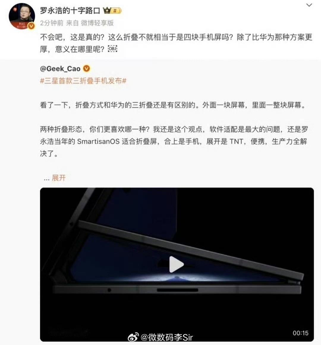 罗永浩谈三星三折叠那你老罗别光说不做给大家打个样做个三折叠出来不就行了