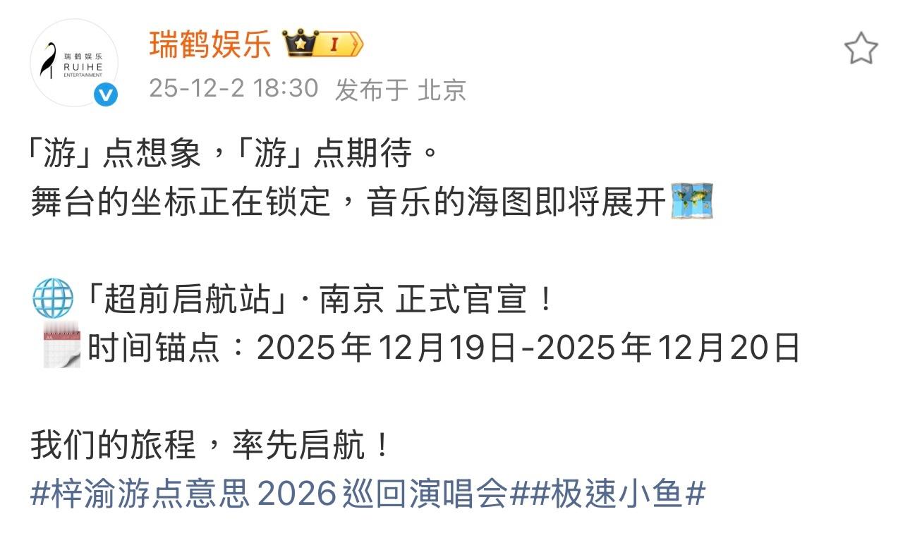 梓渝南京演唱会官宣,2025年12月19日-2025年12月20日在南京梦之蓝青奥体育公园体育馆连场两天,好好奇歌单、舞美和妆造呀!期待🤩