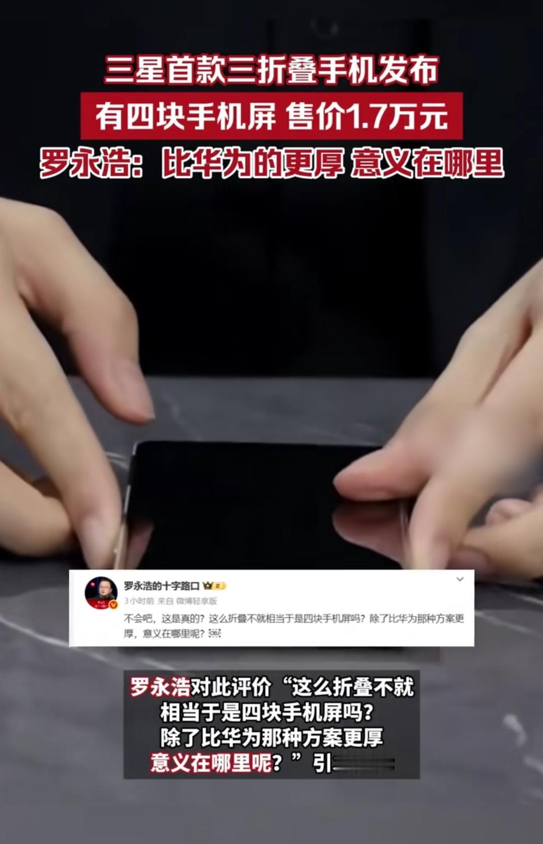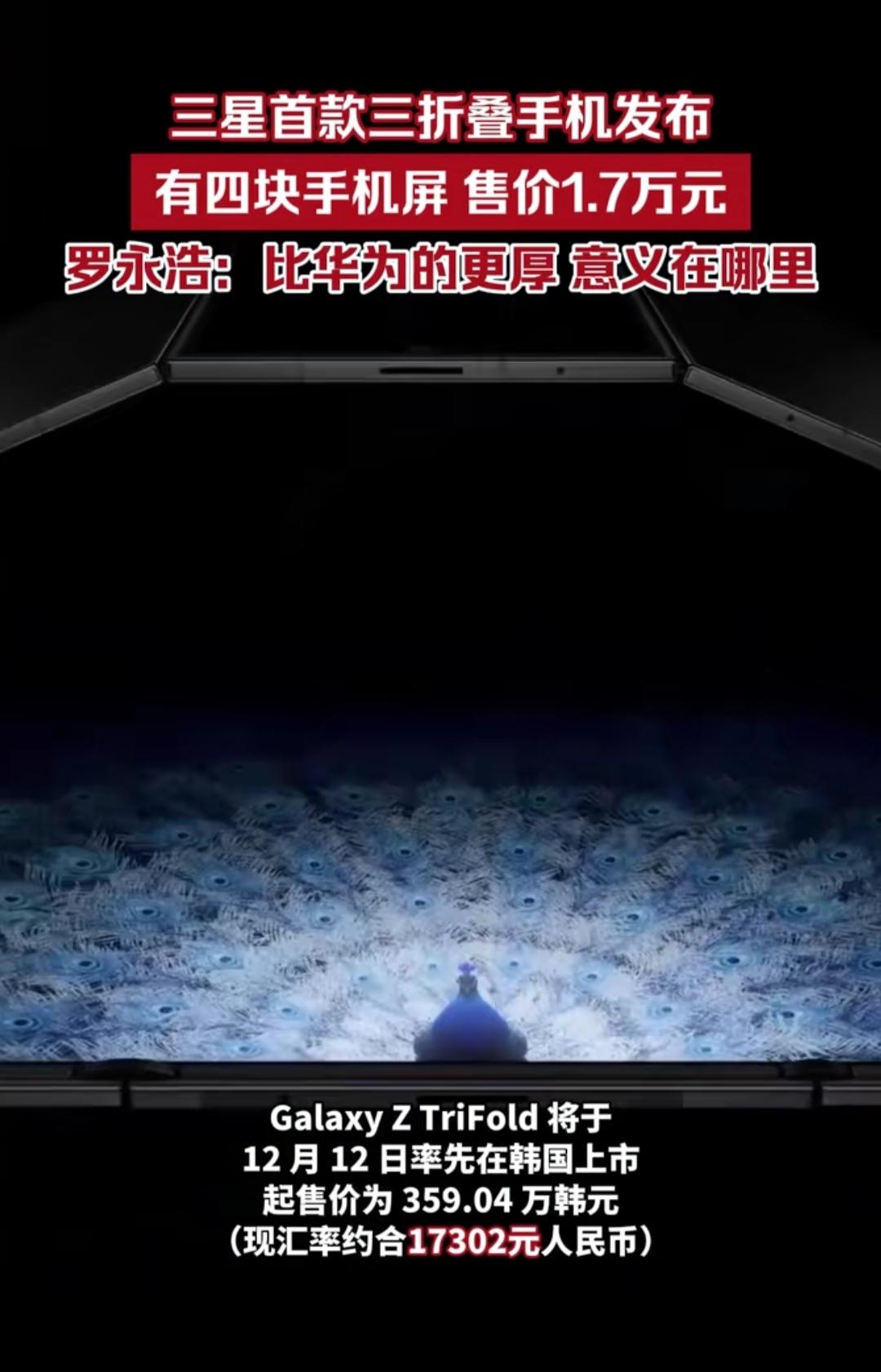 刚刷到三星出首款三折叠手机,我直接看愣了。159.2×75.0×12.9mm的折叠尺寸,外屏6.5英寸,展开居然是10英寸大屏,拿在手里跟揣个小平板似的。 这配置确实能打,定制版骁龙8 Elite芯片,5600mAh电池加45W快充,还有IP48防护。可一看价格,约17302元,瞬间把我劝退。12月先在韩国上市,月底才登陆国内,普通人哪能说买就买。 别光盯着参数和价格,这手机藏着手机行业的内卷真相。从单折叠到双折叠再到三折叠,厂商拼的不只是技术,更是抢占高端市场的野心。 但再花哨的折叠,核心还是要用着顺手。对咱们普通人来说,手机够用、性价比高才实在。这种万元旗舰,更像行业的技术秀,离真正的大众需求终究还是差着一大截啊。