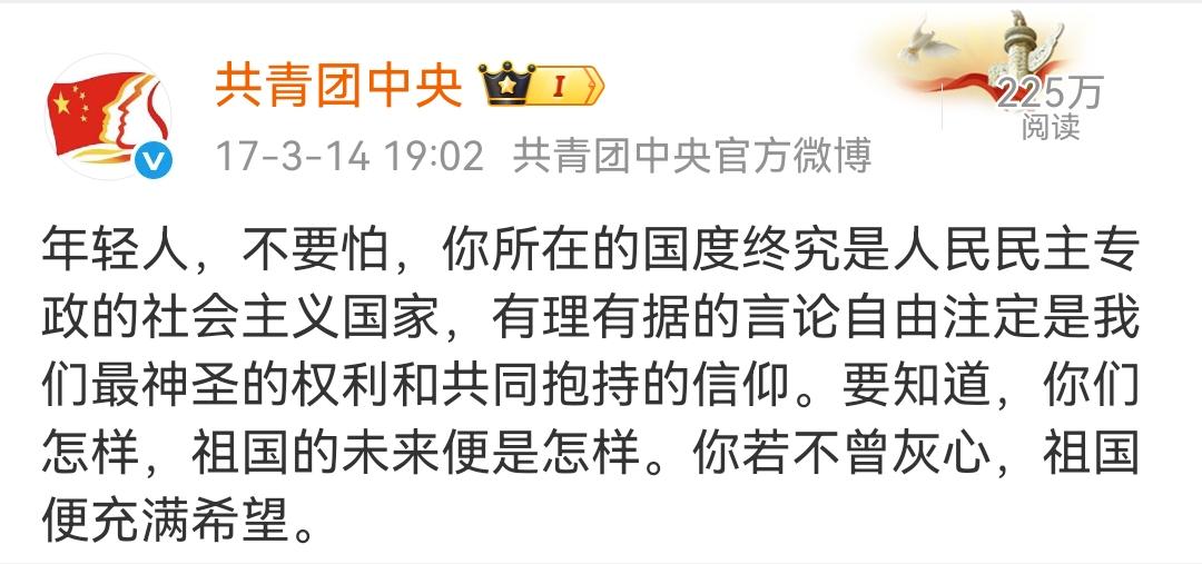 共青团中央:年轻人,不要怕,你所在的国度终究是人民民主专政的社会主义国家,有理有据的言论自由注定是我们最神圣的权利和共同抱持的信仰。要知道,你们怎样,祖国的未来便是怎样。你若不曾灰心,祖国便充满希望。 这是共青团中央2017年3月14日所发的推文,以前是这样的,未来也是这样的,初心从来没有被改变。 各位是怎么看的?欢迎评论区留言。