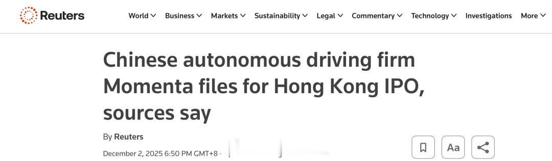 路透社报道,有两名知情人士透露中国自动驾驶技术开发商Momenta已秘密向香港提交了首次公开募股(IPO)的申请新能源汽车Momenta