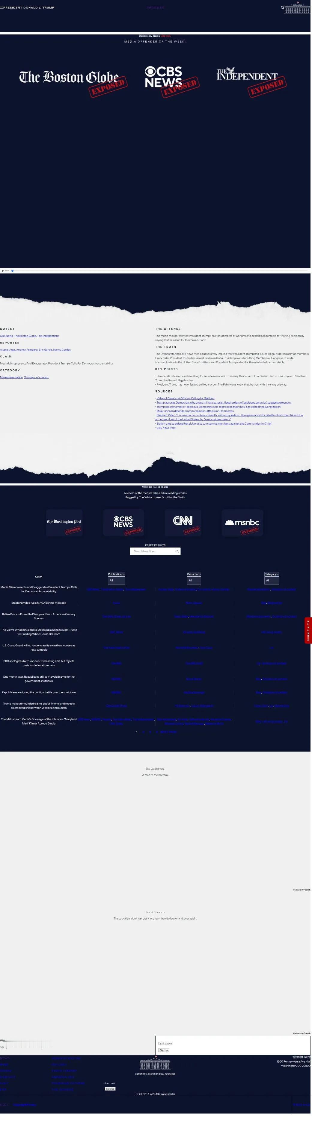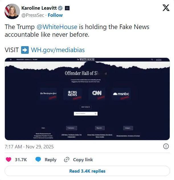 美国白宫日前在其网站上推出了一新页面,“媒体违规者(Media Offender)”,旨在抨击媒体机构对特朗普政府行为的“假新闻”报道。白宫新闻秘书卡罗琳·莱维特在X平台上发布帖子宣布了白宫的这个新页面,并且说:“特朗普@白宫正以前所未有的方式追究虚假新闻的责任。” 这个新页面设置有“违规耻辱馆”与“每周媒体违规者”,公示“扭曲报道”的媒体、记者与相关报道。 该页面上部写着:“误导,偏见,揭露”。 截至新页面发布时,白宫新页面将CBS新闻、《波士顿环球报》和《独立报》列为“每周罪魁祸首”,原因是它们对老特批评“煽动六人组”——美国国会6名民主党人制作的一段视频(密歇根州民主党参议员埃莉萨·斯洛特金和另外5名曾在军事或情报机构任职的民主党国会议员于11月18日出现在一段视频中,呼吁这些部门的人员忽视老特所谓的“非法”命令)的报道存在偏见。 白宫新页面称,这些媒体未能提供背景信息,对老特关于该视频的问责呼吁进行了错误报道。老特表示,该视频试图在军人群体中煽动不服从行为。白宫新页面称:“媒体对特朗普总统要求国会议员为其煽动叛乱行为负责的呼吁进行了歪曲报道,称他要求对他们进行‘处决’。” 白宫新页面还说:“民主党人和‘假新闻’媒体恶意暗示特朗普总统曾向军方下达非法命令。特朗普总统发布的每一项命令都是合法的。现任国会议员在美国军队中煽动不服从是危险的,因此特朗普要求他们为此负责。” 白宫新页面设立的“违规耻辱馆”列出了白宫认为其报道存在各种歪曲的媒体,这些歪曲包括“左翼疯狂”“错误描述”“循环报道”“偏见”和“虚假指控”。被列入“违规耻辱馆”的媒体包括MS NOW(前身为MSNBC)、CNN、《华盛顿邮报》、CBS新闻、《纽约时报》和《今日美国》。 近年来,多家媒体因对老特的报道不友好而陷入麻烦,其中一些媒体在面临诉讼后与老特达成和解。英国《每日电讯报》获得了一份文件,详细说明了英国广播公司(BBC)在其纪录片中使用了2021年1月6日老特演讲中相隔54分钟的剪辑片段,以此让观众误以为他鼓励了当天晚些时候国会大厦的骚乱事件,随后BBC因此受到抨击。 英国广播公司主席萨米尔·沙阿于11月13日致信老特,表示道歉,还开除了两名高管,并且表示该纪录片将不再播出。 2024年12月,老特在2024年3月19日就诽谤问题起诉ABC之后,与ABC达成1500万美元和解。2024年3月10日,在共和党南卡罗来纳州众议员南希·马斯的一次争议性露面中,ABC节目《本周》主持人乔治·斯蒂芬诺普洛斯错误地声称老特被判定“强奸罪成立”。 2025年7月2日,派拉蒙公司宣布已就老特针对2024年10月《60分钟》对时任副总统卡玛拉·哈里斯采访的编辑方式提起的100亿美元诉讼达成和解。