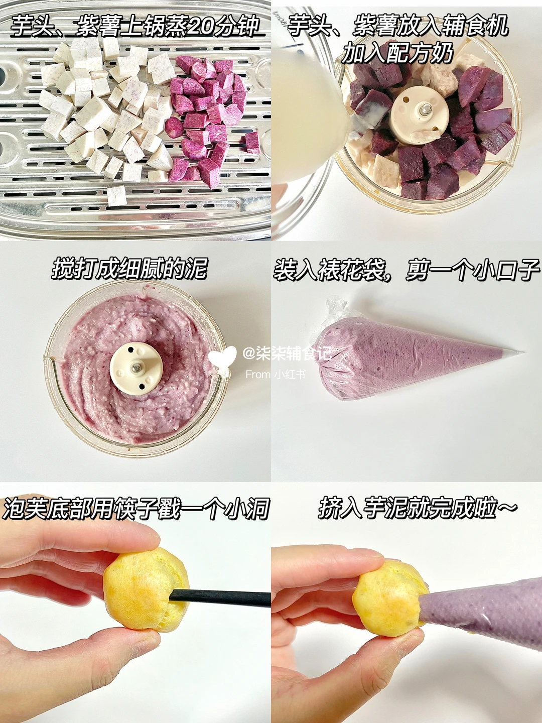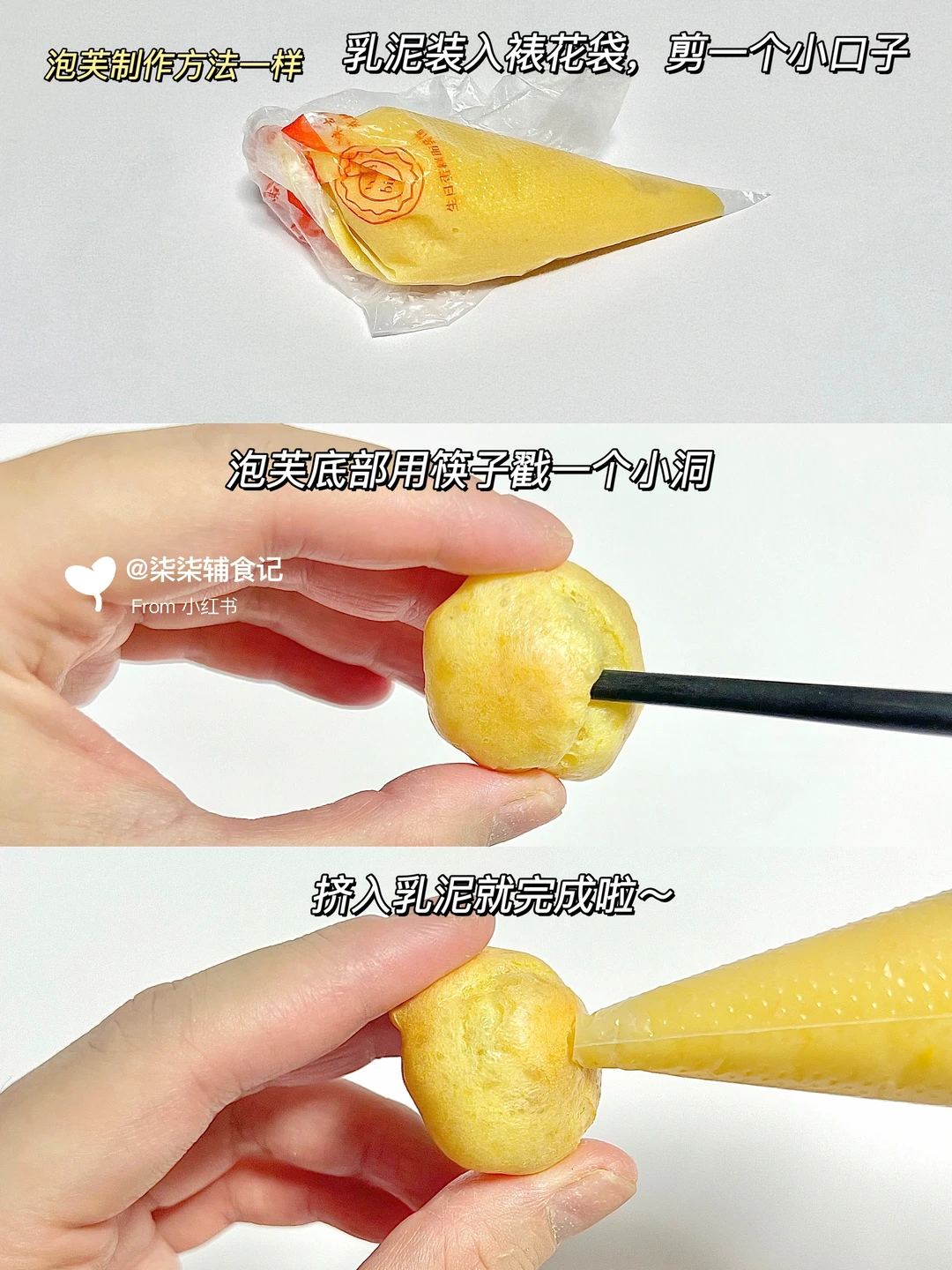 ▫️泡芙底部用筷子戳一个小洞,把芋泥和乳泥挤入填满就完成啦~