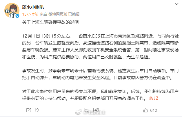 涉事蔚来车辆未开启辅助驾驶系统,碰撞发生后车门自动解锁,车门把手自动弹开,车辆动力电池未发生安全风险。目前事故原因警方仍在调查中。