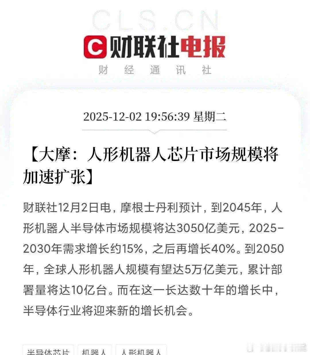 好消息!大摩惊人预测:人形机器人芯片市场规模将达3050亿美元!这些龙头公司要受益了!刚刚,投行摩根士丹利,发出了一份惊人的产业报告!预计到2045年,人形机器人半导体市场规模,将达到3050亿美元;到2050年,人形机器人整体规模,将冲击5万亿美元的天文数字,累计部署量将达到10亿台!一个将有数十年,高速发展期的超级赛道,才刚刚开始!为什么说这是一份“世纪性”的预测报告?1.明确了芯片是核心中的核心,价值占比惊人报告首次量化了,半导体在人形机器人中的价值,确认了其在产业链中的核心地位。3050亿美元的芯片市场规模,意味着,其将成为驱动整个人形机器人产业的“心脏”和“大脑”。高端算力芯片、传感器芯片、功率半导体等,将会呈指数级增长。2.给出了明确的时间表和爆发节点报告没有空谈远景,而是给出了“2025-2030年平稳起步,之后加速爆发”的清晰增长路径。这为投资者的布局,划出了关键的时间窗口:未来几年是技术打磨,和供应链形成的关键期,随后将迎来商业化放量的主升浪。3.全球产业巨头的前瞻布局大摩的预测,并不是空穴来风,它是调研对特斯拉、Figure、优必选等巨头,在这个产业的千亿级投入,宝马、亚马逊等企业开始试点应用。产业从“概念验证”,迈向“规模应用”的临界点,正在快速的逼近。产业链受益方向10亿台的市场,将改变整个高端制造和半导体产业链格局,各环节的领头羊,已经浮出水面:1. 核心芯片(“大脑”与“感官”) AI SoC(系统级芯片):中兴通讯、瑞芯微、全志科技等。 高端MCU(微控制器):兆易创新、中颖电子、峰岹科技等 视觉传感器:韦尔股份、格科微、思特威等 第三代半导体(碳化硅):三安光电、天岳先进、斯达半导等2. 执行器和关节(“四肢”): 伺服系统和减速器:汇川技术、埃斯顿;绿的谐波、双环传动 精密电机:江苏雷利、鸣志电器3. 软件和算法(“灵魂”): 操作系统和算法:东土科技、汇川技术、埃斯顿等 AI训练平台:百度、阿里巴巴、腾讯、科大讯飞等4. 整机集成与场景落地: 整机制造:埃斯顿、新松机器人、小鹏、宇树、优必选 部件与代工:拓普集团、三花智控
