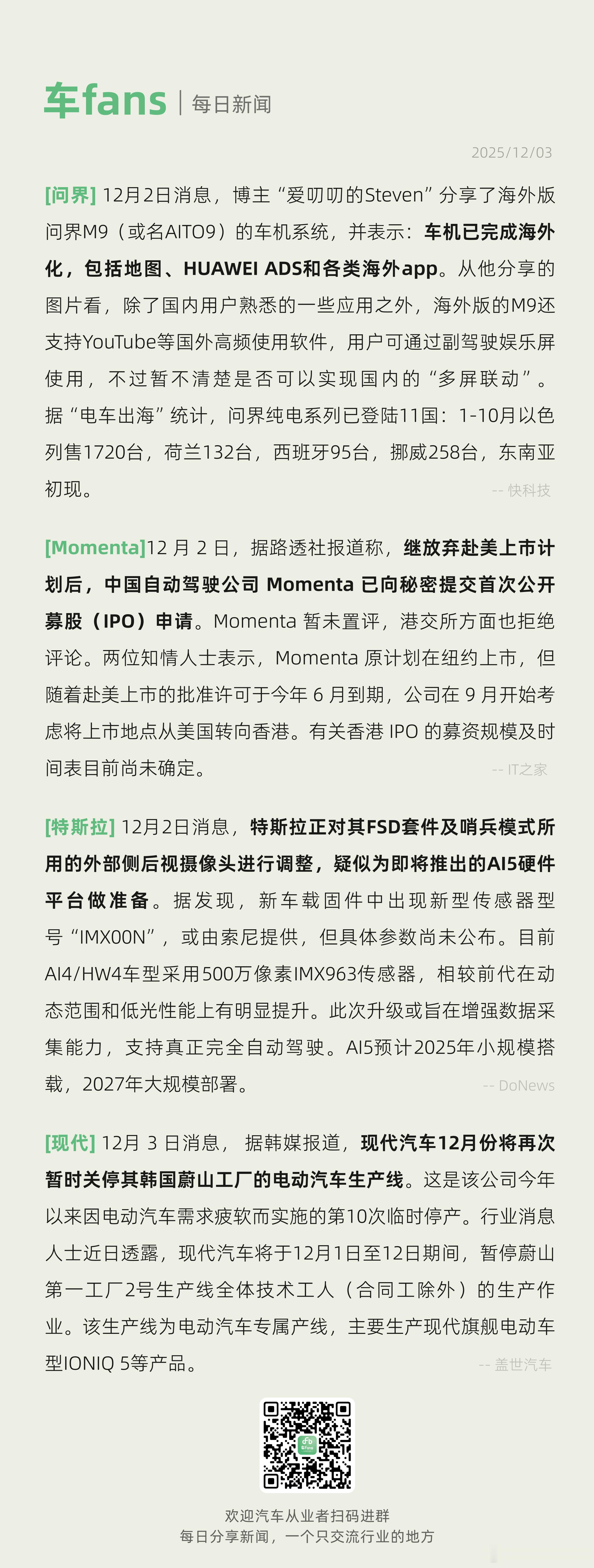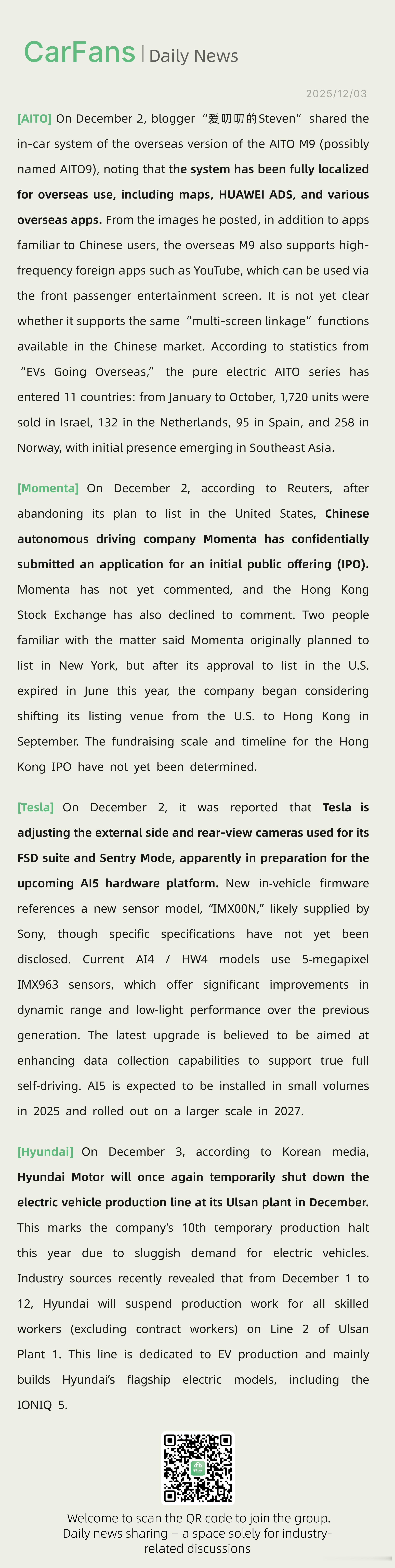 特斯拉调整FSD套件及哨兵模式外部侧后视摄像头、现代再次关停韩国蔚山电动车生产线,特斯拉正对其FSD套件及哨兵模式所用的外部侧后视摄像头进行调整,疑似为即将推出的AI5硬件平台做准备。据发现,新车载固件中出现新型传感器型号“IMX00N”,或由索尼提供,但具体参数尚未公布。目前AI4/HW4车型采用500万像素IMX963传感器,相较前代在动态范围和低光性能上有明显提升。此次升级或旨在增强数据采集能力,支持真正完全自动驾驶。AI5预计2025年小规模搭载,2027年大规模部署。特斯拉也要上新硬件了新能源汽车
