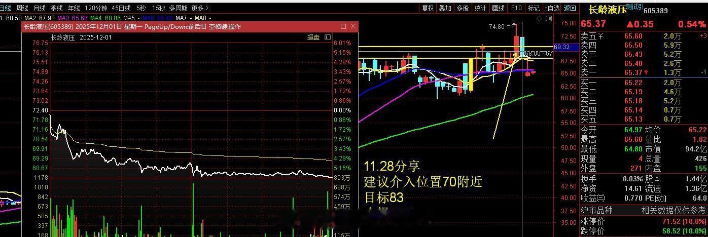 说一下前两天长龄液压这支。说了建议回调 70 附近参与,但是看第二天的分时走势还应该去做吗?学点技术吧,回调 70 附近参与,是 70 支撑有效去做,直接破了还去做。哎,不是我想推卸责任,是真想让你们学点东西。这也是为什么我每次止损都写,而目标不是每次都写的原因,就是怕有人不懂盲目跟随。