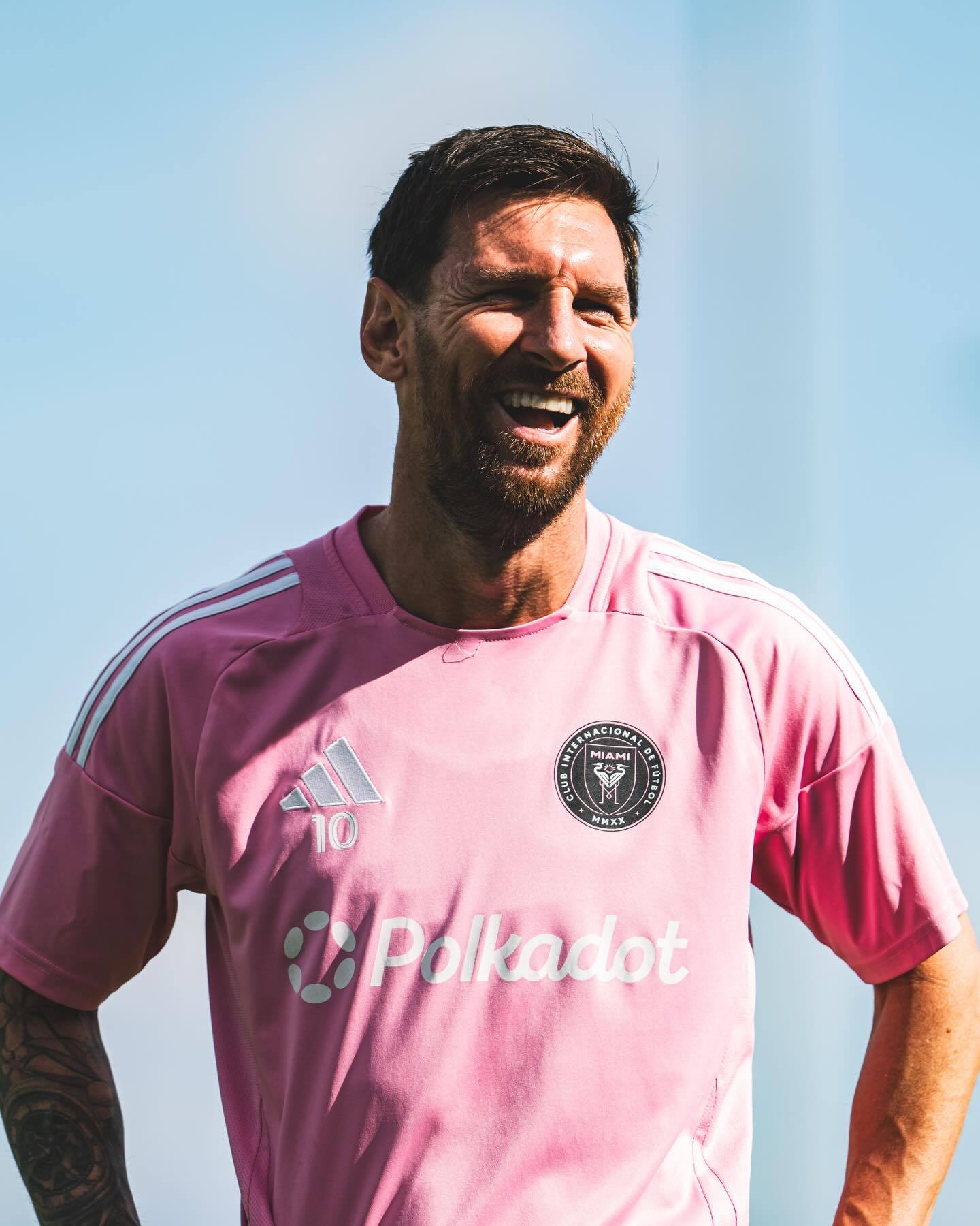 笑容满面,今日份随队训练的梅西梅西迈阿密国际vs温哥华白浪