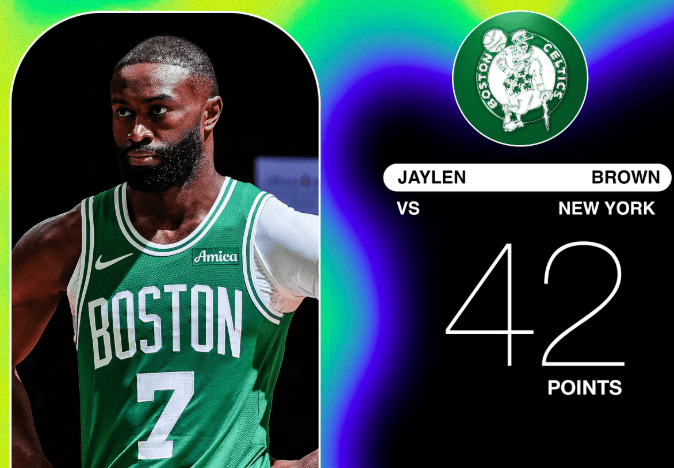全场比赛,凯尔特人前锋杰伦-布朗首发出战40分钟,24投16中,三分球6投2中,罚球9罚8中得到42分4篮板4助攻1抢断。