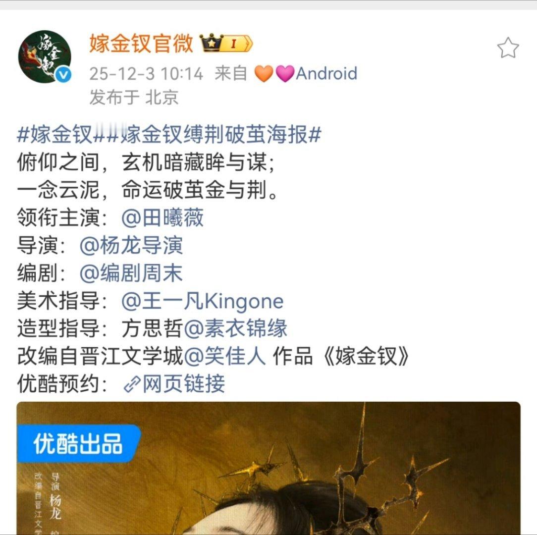 田曦薇嫁金钗官宣,只官宣了制作班底和女主,田曦薇这算单人过会吧?