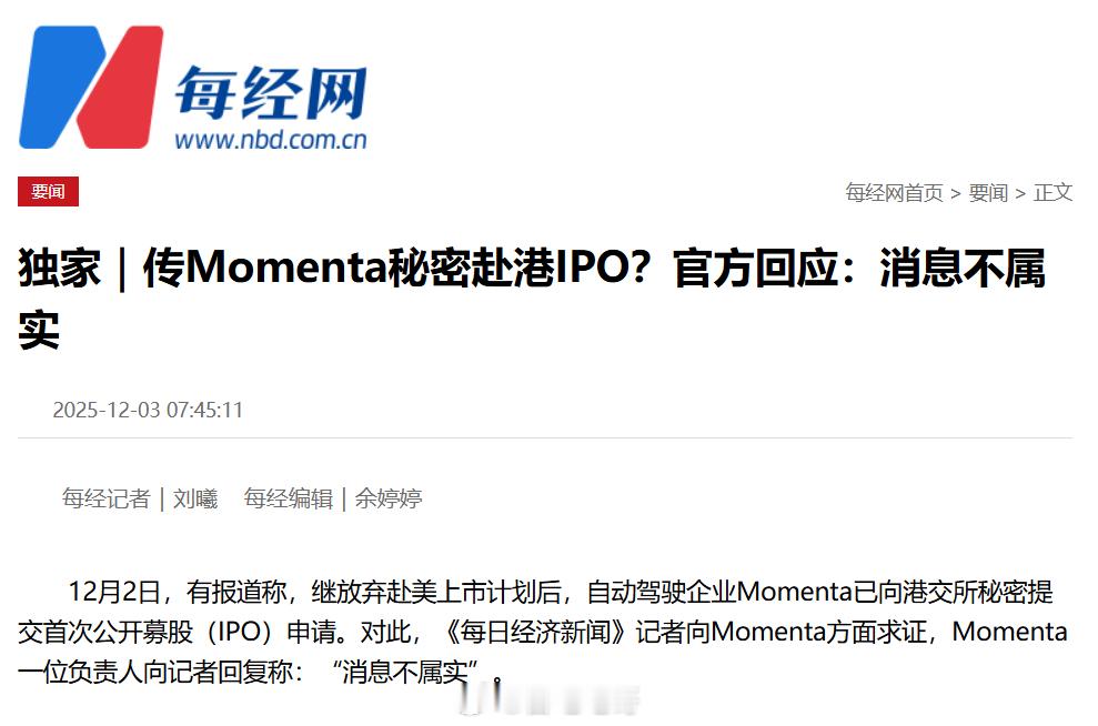 《每日经济新闻》的独家,Momenta 一位负责人辟谣了赴港 IPO 的消息。上市传闻来自于路透社此前的报道:两位知情人士透露,Momenta 已秘密向香港交易所提交 IPO 申请,转向香港而非原计划的纽约上市。Momenta辟谣赴港IPO