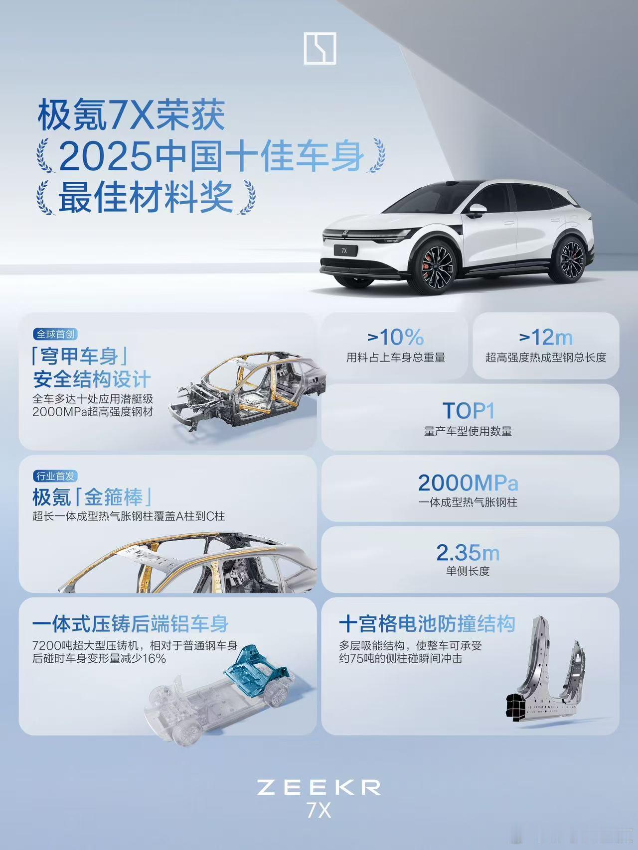 被央视实测点赞的焕新极氪7X,安全实力从不是空谈。拿下C-NCAP与Euro NCAP双五星,包揽中国十佳车身及最佳材料奖,硬核认证拉满。车身超83.3%高强度钢材加持,10处2000MPa热成型钢搭配两根2.35m“金箍棒”,连2.5吨卡车都能稳稳吊起。车内细节更戳心,一键破窗、应急机械拉手快速避险,带气囊儿童座椅能将孩童头颈弯折角度压至50°以下,全家出行都安心!央视点赞极氪金箍棒安全标准制定者