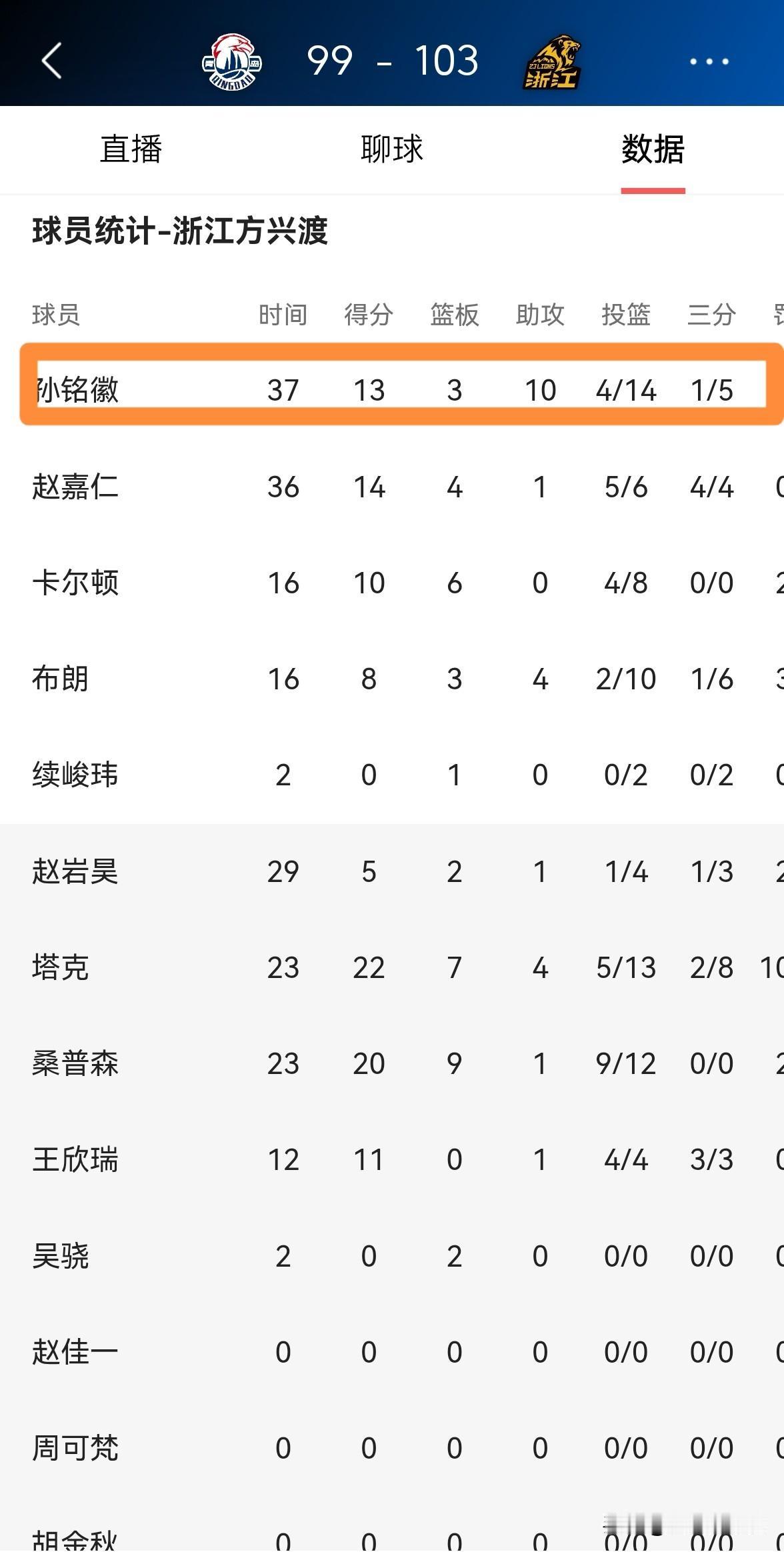 谁能拯救一下浙江方兴渡超级球星孙铭徽的投篮?在今天浙江方兴渡以103:99险胜青岛崂山啤酒的比赛中,孙铭徽在投篮端的表现非常拉胯。 全场比赛下来,孙铭徽首发出战37分钟,投篮14中4,其中三分球5中1、罚球4中4得到13分3篮板10助攻2抢断2盖帽。 实事求是的说,如果孙铭徽擅长投篮的话,那么中国男篮国家队必有他的一席之地。