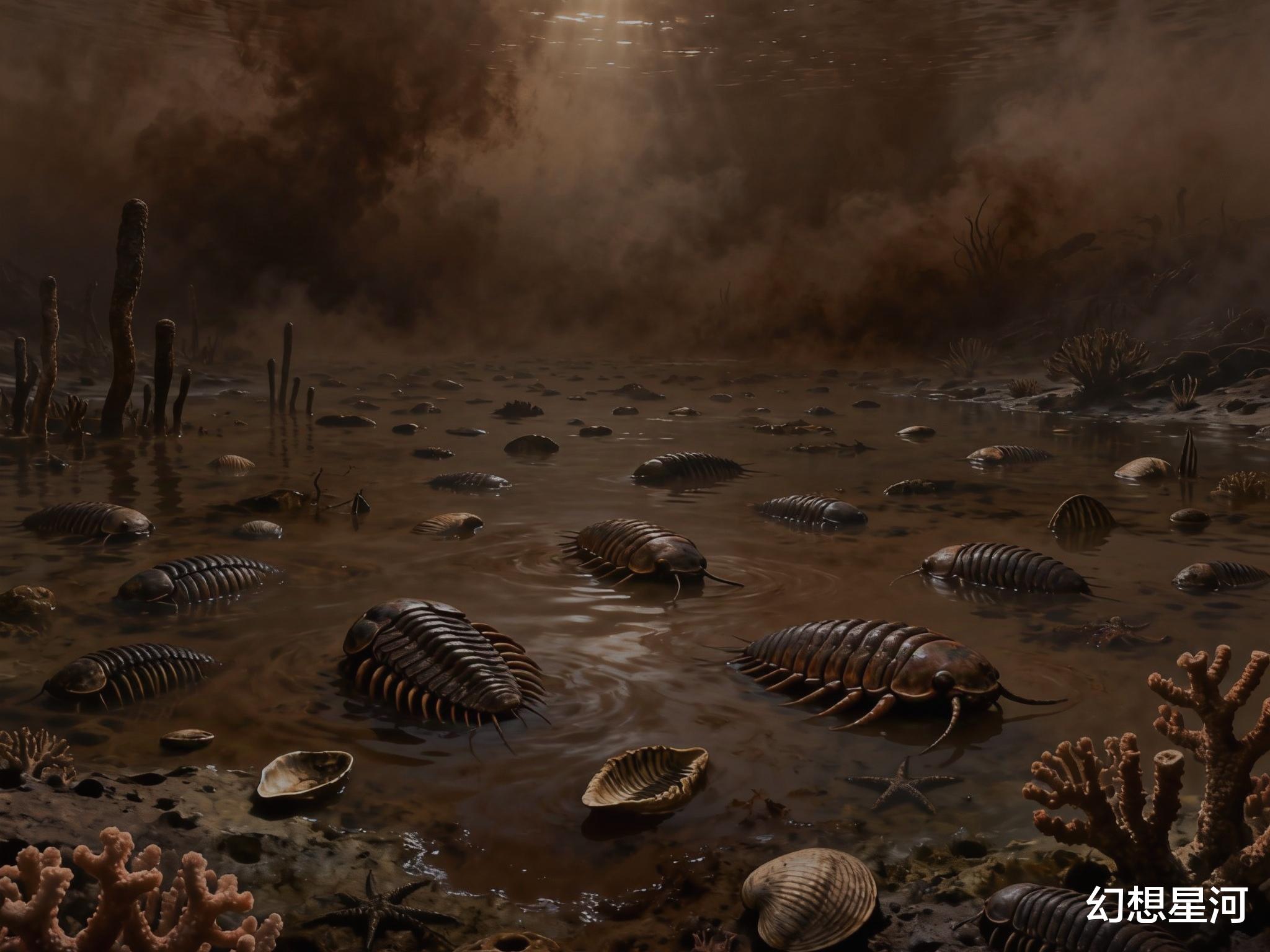 海洋表层的浮游生物成片死亡,遮天蔽日的褐色烟雾挡住了一半阳光,原本完整的食物网从最底层开始崩塌。海平面急剧回落,全球气温随之骤降,最终变成干尸的是被直接晾在裸露海底的浅海生物。不过数年时间,地球上85%的物种永远消失,奥陶纪—志留纪大灭绝成为地球生命史上最惨痛的印记之一。