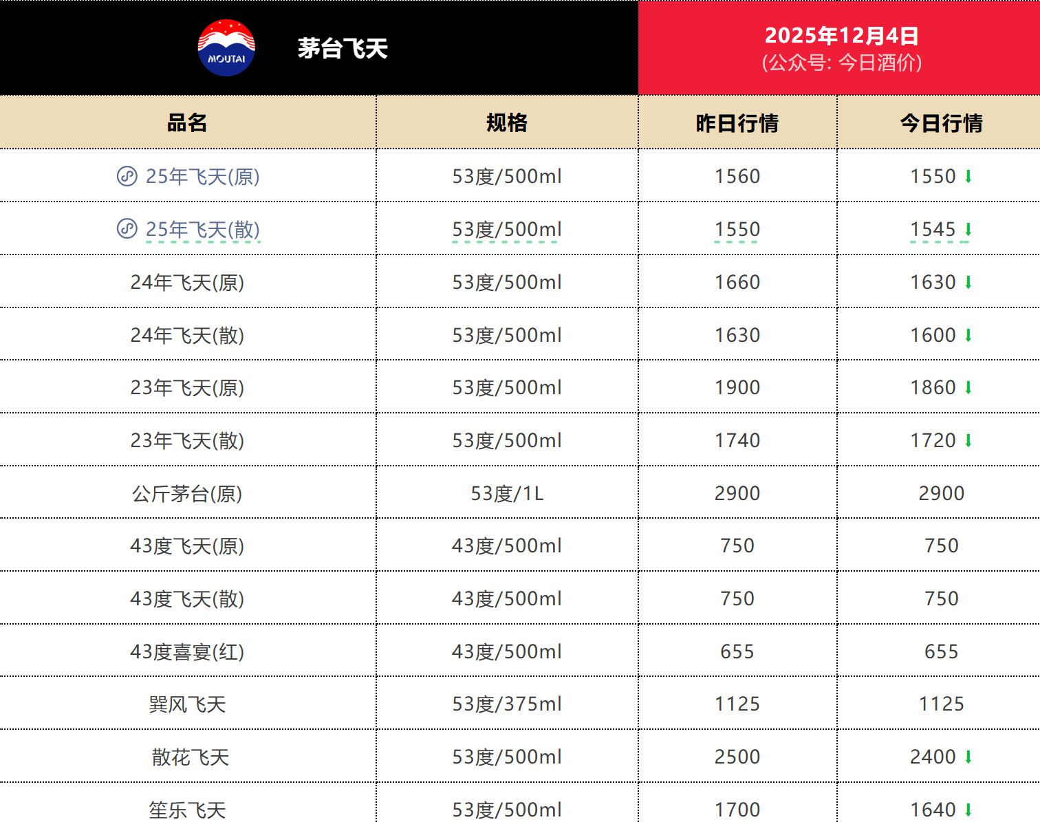 上证报中国证券网讯(记者高志刚)继近日跌破1600元关口之后,飞天茅台价格继续下滑。据酒业数据平台“今日酒价”12月4日最新数据显示,25年飞天(散)53度/500ml批发价为1545元/瓶,较昨日下跌5元;25年飞天(原)53度/500ml价格报1550元/瓶,较昨日下跌10元。