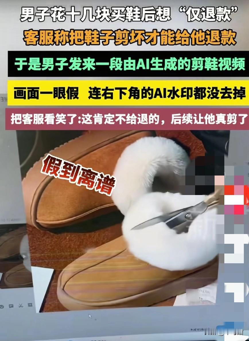 一顾客在网上买了一双毛鞋,结果有点轻微的开线,这种情况,一般我们正常人就拍照发给客服,要么换一双,要么就退款。 可这位顾客不一样,想要留下又不愿意花钱,就去申请仅退款。要退款也行啊,商家说要么退回来吧,要么就发段鞋子剪坏掉,不能再穿的视频给他们。 可这顾客一门心思都在,又要留下鞋子保留穿,又觉得开线了不值钱了,就应该把钱退还他的想法。于是,人家聪明的动了脑子,竟然去AI了一段剪鞋子的视频给店主发了过去。 可是这AI又太入门级了,剪刀都飘在鞋面上了,鞋子上的毛毛像棉花一样的飘落下来,实在看着太假了,最主要后下角还有一句,AI生成的字样。 客服看到这段视频都笑的无语了,做人怎么一点不真诚呢,于是叫他继续剪,剪到满意为止,最后无奈,顾客只有真的剪掉了鞋子,对方才退款了。 这怎么说呢,说他聪明吧人家还会用AI,说他笨吧他只会用AI,却不知道编辑和剪辑。商品质量有问题,退换货又不花钱,老想着贪便宜,最后还被广大网友笑话。 (图片来自网络视频)