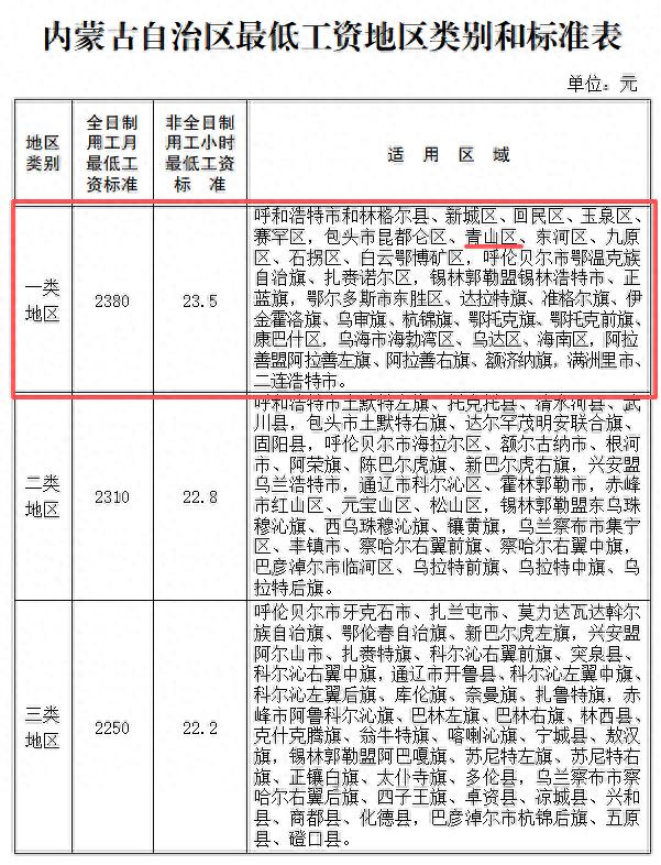 根据《中华人民共和国劳动法》《最低工资规定》等相关规定,结合内蒙古自治区经济社会发展和职工工资水平增长等情况,经人力资源社会保障部核准,内蒙古自治区人民政府决定调整全区全日制月最低工资标准和非全日制工作小时最低工资标准。现将有关事宜通知如下:
