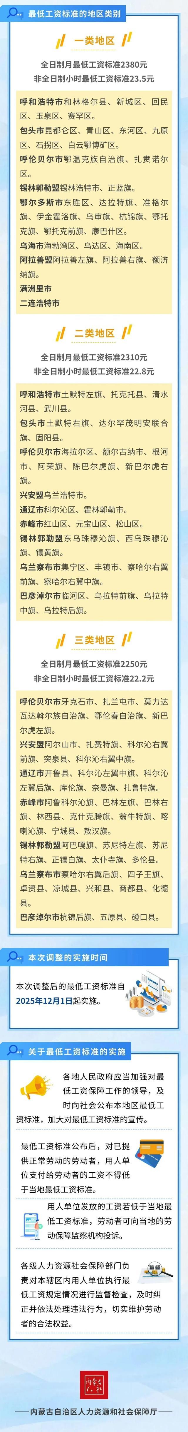 四、调整后的全日制月最低工资标准和非全日制工作小时最低工资标准自2025年12月1日起执行。原《内蒙古自治区人民政府办公厅关于调整自治区最低工资标准的通知》(内政办发〔2024〕46号)同时废止。
