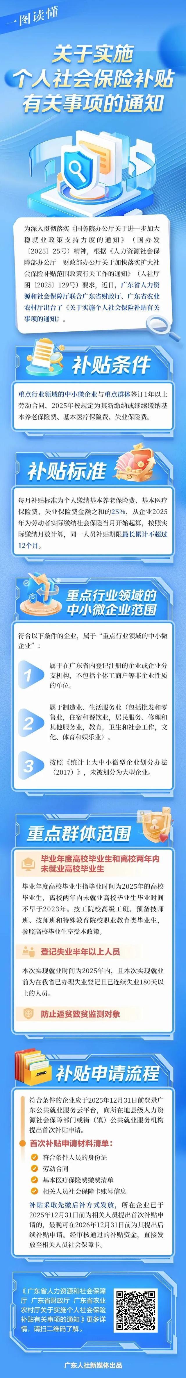 近日,广东省人力资源和社会保障厅联合广东省财政厅、广东省农业农村厅出台了《关于实施个人社会保险补贴有关事项的通知》。