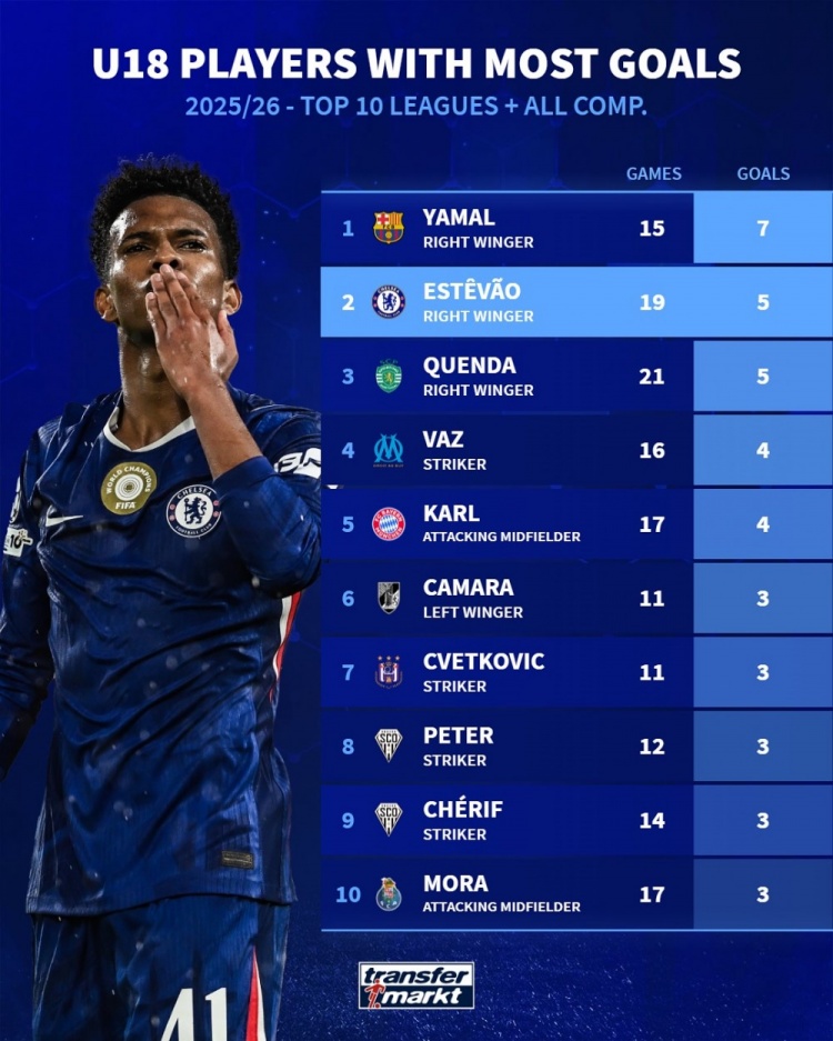 直播吧12月6日讯德国转会市场统计了本赛季前十联赛U18球员的进球数量,并列出榜单,亚马尔7球居首,埃斯特旺5球并列次席。