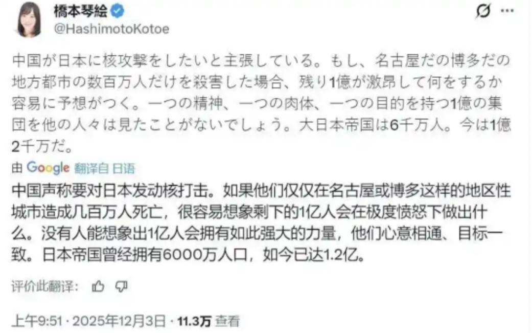 日本右翼一语惊人:若中国核弹造成日本几百万人死亡,那剩下的1亿日本人将开始反击。 不得不说,日本右翼是真的很敢说!当地时间12月3日,日本右翼核心人物桥本琴绘在社交媒体上发文,声称要是中国对日本发动核打击造成几百万人死亡,剩下的1亿多日本人就会团结起来反击。 这个出生于广岛核爆幸存者家庭的右翼作家,一边在《大东亚战争的新肯定》中为侵略历史翻案,一边在2025年12月抛出“中国核打击日本城市,1亿人将复仇”的狂言,其逻辑链条中藏着三重错位的现实认知。 首先是对核战争的无知。她刻意忽略中国“不首先使用核武器”的国策,将名古屋、博多假设为核打击目标,却选择性遗忘广岛长崎的废墟记忆——1945年两颗原子弹让日本20万人瞬间蒸发,当时拥有完整战争机器的日本选择的是投降而非反击。 如今中国核力量远超当年美军,若真发生核冲突,东京、大阪等核心城市的毁灭将直接瘫痪日本国家机器,所谓“1亿幸存者”不过是军国主义式的数字游戏。 日本作为《不扩散核武器条约》缔约国,连核反击能力都不具备,桥本口中的“复仇”,本质是将国民生命绑在美国核保护伞的赌桌上。 其次是对社会现实的误判。她反复强调“现在日本人口是二战时的两倍”,却避谈2024年日本1.24亿人口中,65岁以上占30%,15岁以下仅占11.3%的残酷现实。 盖洛普民调显示,日本青年愿为战争牺牲的比例全球倒数第一,所谓“1亿愤怒国民”,在少子化泥潭中更可能是“1亿求稳的普通人”。 2023年自卫队征兵缺口达1.5万人,连常规兵力都难以维持,何谈核战后的全民动员?桥本的“玉碎”幻想,与泡沫经济破灭后日本社会“草食系”“平成废宅”的普遍心态形成刺眼反差。 最关键的是政治投机的本质。她的言论精准踩中高市早苗政府的右翼节奏。2025年防卫预算突破GDP2%、出云级航母化、战斧导弹部署,一系列突破和平宪法的动作需要民意支撑。 桥本的“核威胁论”,实质是为“反击能力”合法化制造舆论:通过虚构“中国核打击”的被害场景,将修宪扩军包装成“自卫”,将民众对核灾难的恐惧转化为对右翼政策的默许。 这种操作并不是什么新发明,2012年“购岛”闹剧、2024年台海有事论,都是同类剧本的翻演——用外部危机掩盖国内少子化、财政赤字等结构性矛盾。 其实,桥本的“1亿复仇”论暗含对历史的篡改。她刻意回避1945年日本投降后,天皇制保留、美军占领、经济依附的现实路径,反而虚构出“全民抗战”的军国主义叙事。 这种叙事在右翼圈子里形成闭环:2025年日本会议的集会中,右翼青年举着“核武装是生存权”的标语,与桥本的“肉体与精神同目标”遥相呼应,却无人敢提广岛原爆资料馆里,至今陈列的婴儿玻璃奶瓶,那是核爆瞬间被高温融化的平民遗物。 当桥本们沉浸在“1亿复仇”的幻梦中时,日本列岛的地壳正以每年10厘米的速度向马里亚纳海沟移动,这或许是对所有战争狂想最残酷的隐喻。