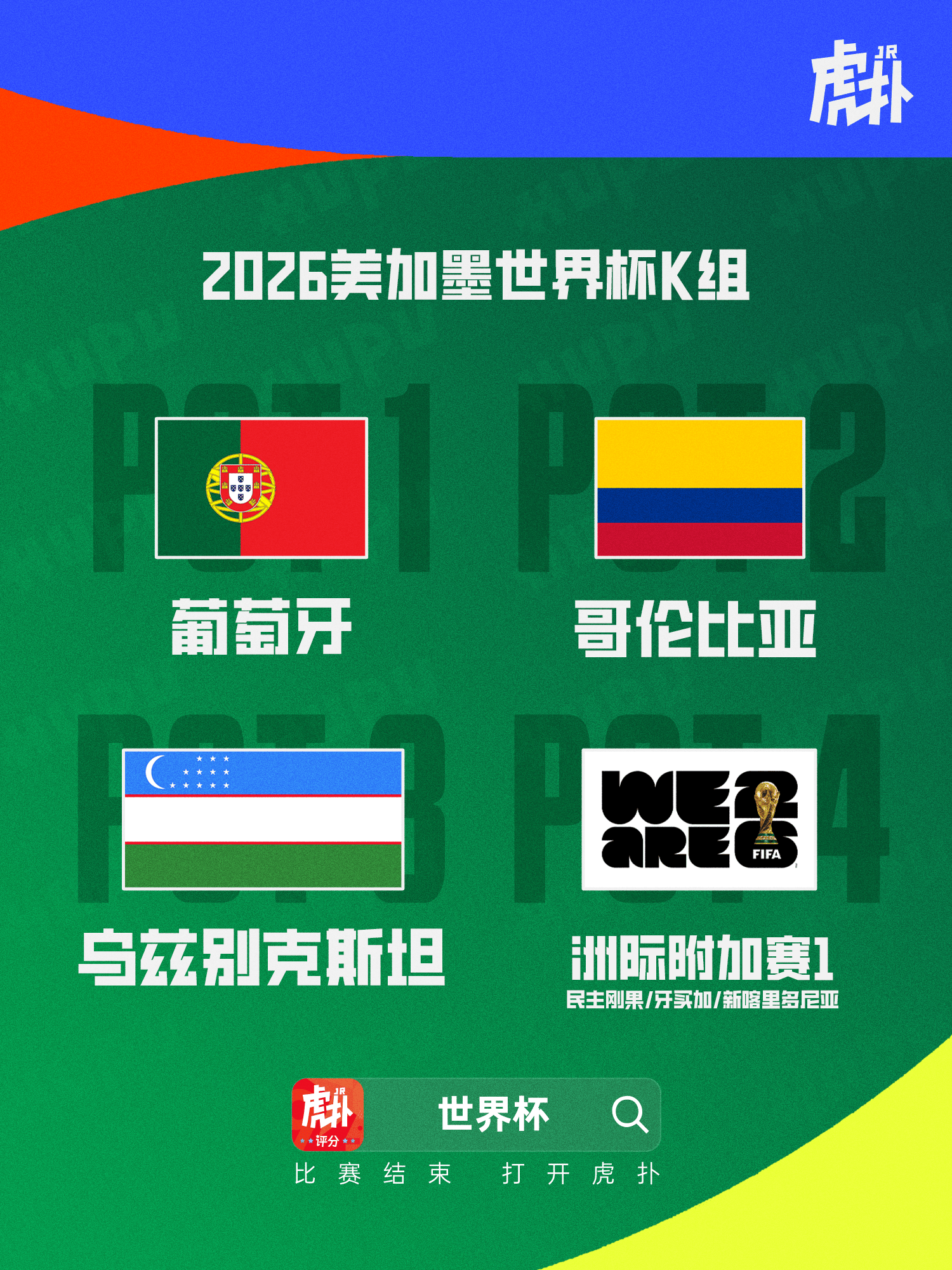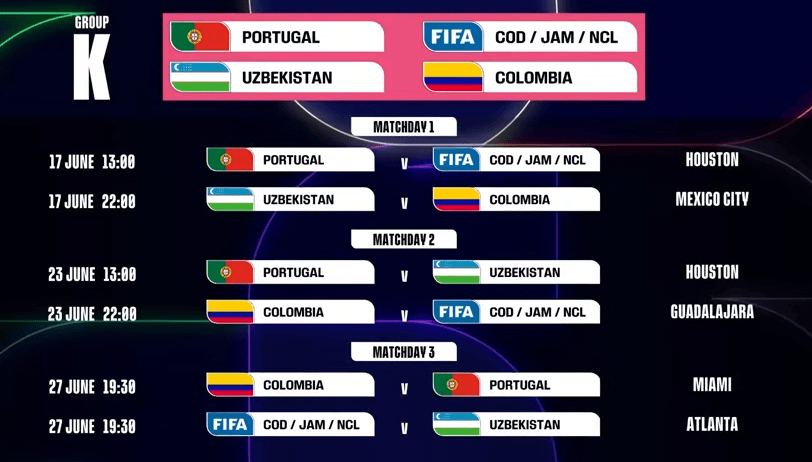 虎扑12月07日讯2026美加墨世界杯赛程全部公布,K组赛程如下(北京时间):