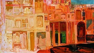 以油画形式表现石窟艺术主题,其难点还在于对空间的重构。古代石窟多顺应山体走势进行开凿,位于河谷断崖,往往是U字形的立体空间。在此空间内,造像的塑造囊括浮雕、圆雕等多种技法,且受到两侧崖壁的遮挡,其光影关系颇为复杂。因此,要将这样的立体空间转化为画布上的平面图像,同时保留油画本体语言的特性,便需要创作者以多样的观察视角重新审视对象,通过构图的精心编排、视点的巧妙挪移以及光影的主观处理,寻得超越物理再现的艺术表达。