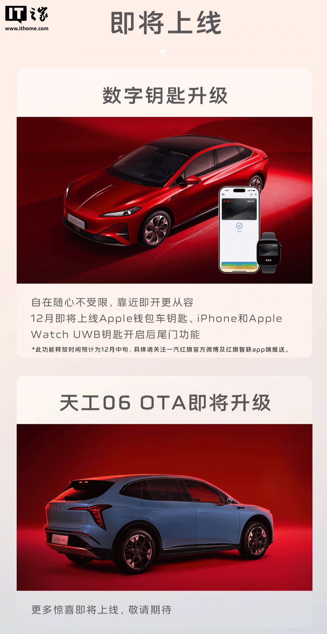 IT之家注意到,一汽红旗天工05还官宣将在12月上线苹果数字钱包车钥匙,支持UWB开启后尾门等功能。
