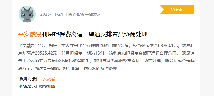 更值得关注的是,投诉中频繁出现对收费结构不透明的指控。有用户指出,其贷款剩余本金为68250.1元,但对应利息高达29525.42元,且单期担保费达1591元。借款人称,这些费用远超合理范围,且签约时并未获得清晰说明。