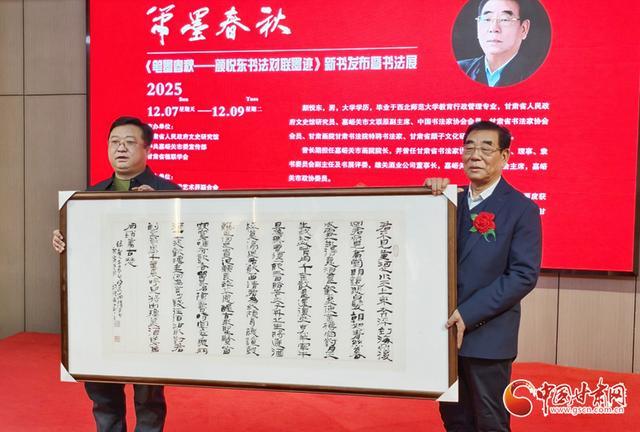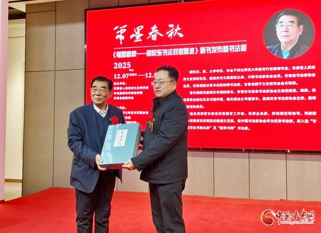 中国甘肃网12月7日讯(西北角·中国甘肃网记者任磊)12月7日上午,《笔墨春秋—颜悦东书法对联墨迹》新书发布暨书法展在甘肃省艺术馆启幕。本次展览集中呈现颜悦东近年来创作的120幅书法作品,同期发布的新书收录楹联作品330副,系统呈现了作者在书法领域的艺术探索与创作成果。