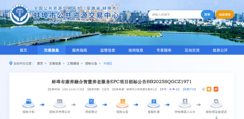 大皖新闻讯记者12月8日从蚌埠市公共资源交易中心网站获悉,当地发布了蚌埠市康养融合智慧养老服务EPC项目招标公告,该项目合同估算价约为5.5亿元,目前招标正在进行中。