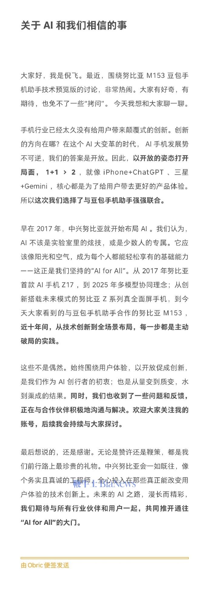 今天,中兴通讯终端事业部总裁、努比亚技术有限公司总裁倪飞发文回应了这次与豆包合作推出“豆包手机”。