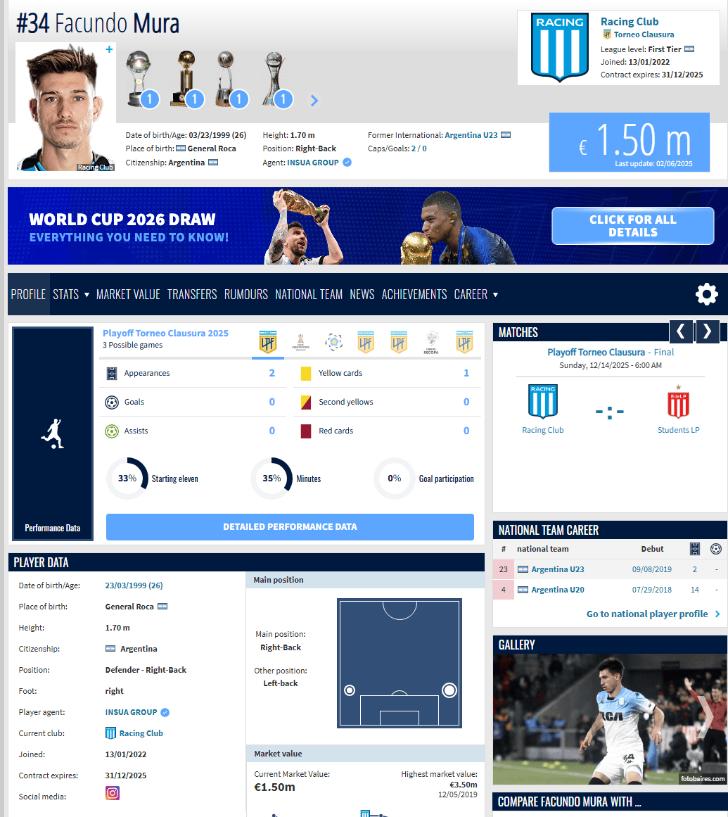 阿根廷竞技队右后卫法昆多-穆拉即将加盟迈阿密国际——这笔交易很快就会正式完成。