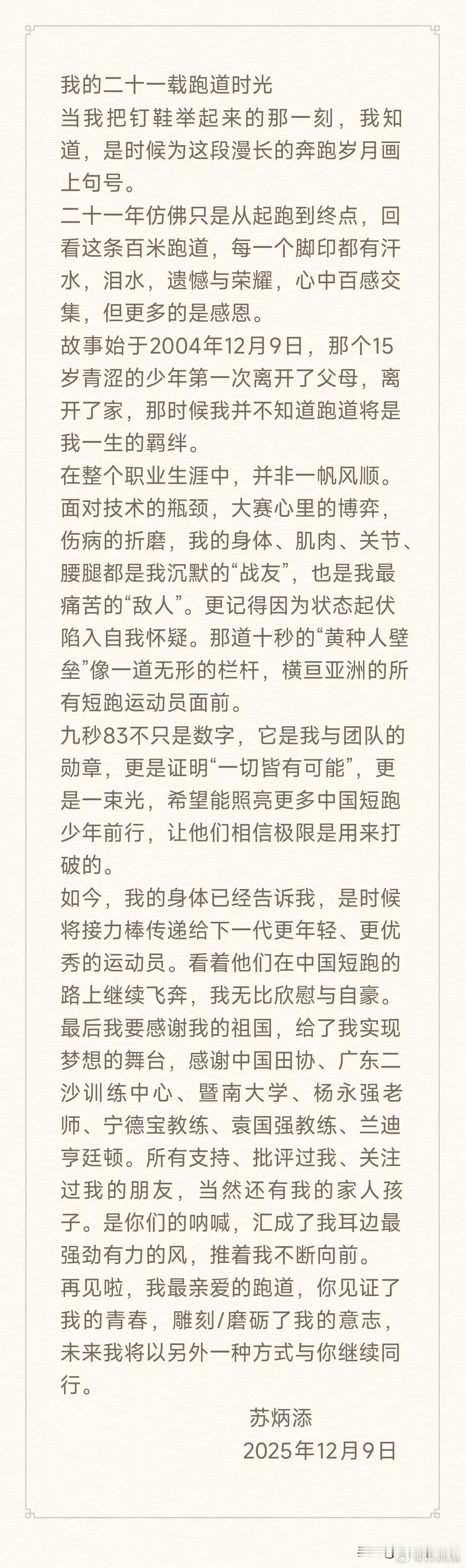 北京时间今天(9日)上午,中国田径短跑运动员苏炳添在社交媒体上正式宣布退役,他撰写长文《我的二十一载跑道时光》。苏炳添表示:九秒83不只是数字,它是我与团队的勋章,更是证明“一切皆有可能”,更是一束光,希望能照亮更多中国短跑少年前行,让他们相信极限是用来打破的。