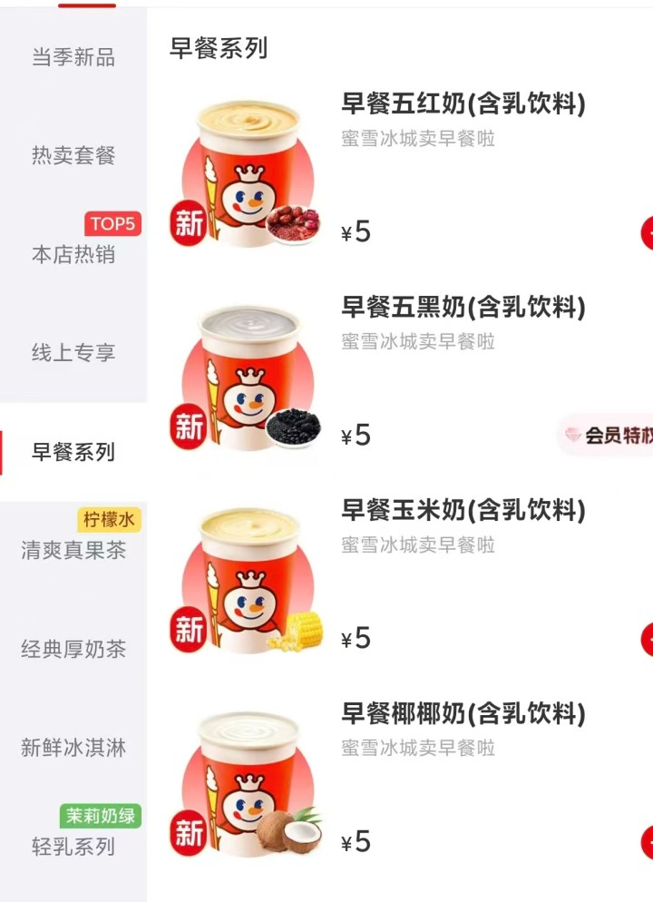 近日,有网友发现在部分城市的门店已经能买到蜜雪冰城的早餐了,小程序点单界面多了“早餐系列”,有五红奶等产品,均售价5元,还推出了7.9元的早餐套装。