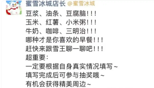 前段时间,蜜雪冰城通过社群和朋友圈发布了“最喜欢的早餐”调查问卷,被传要进军早餐市场。
