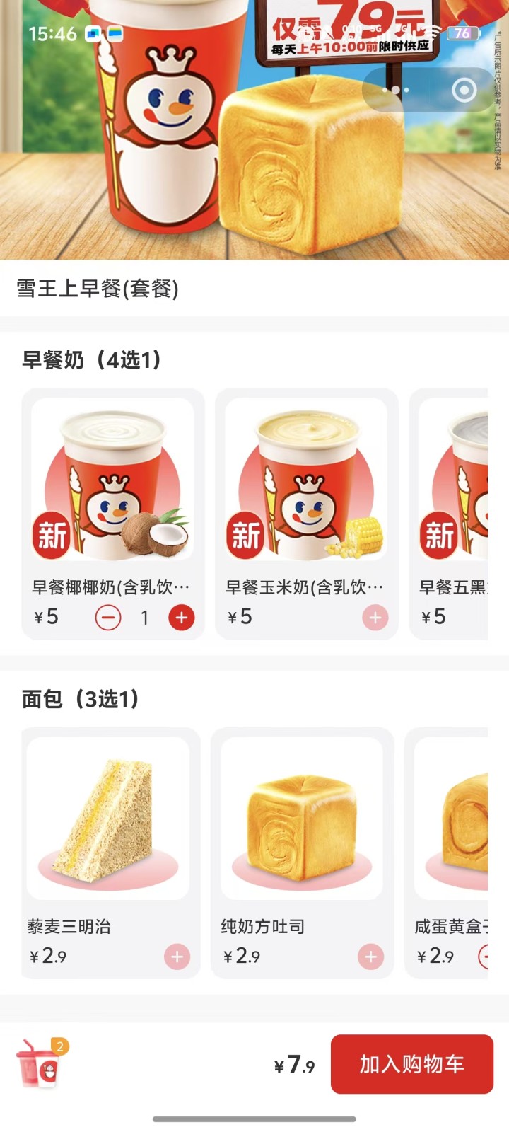 在这些门店的点单小程序里,有一块“早餐系列”区域,里面有4款不同口味的早餐奶,单买价格是5元,菜单拉到底部还有个“随心配套餐”,里面的“雪王上早餐(套餐)”可以选择早餐奶+任意一款面包(藜麦三明治、纯奶方吐司、咸蛋黄盒子),总价为7.9元。