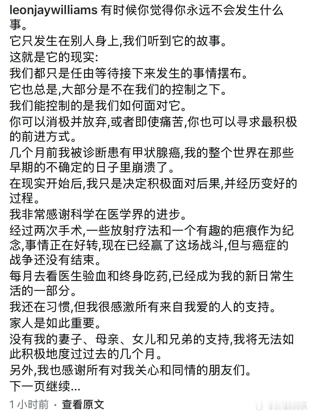立威廉患甲状腺癌后首发文立威廉说要终身吃药 9日,患甲状腺癌后首度在社交平台发文,表示自己在得知病情初期崩溃,但还是决定积极面对现实。经过两次手术和治疗,他的病情逐渐好转,“每月去看医生和终身吃药已成为我的新生活日常,我还在习惯,但很感激所有来自我爱的人的支持”。