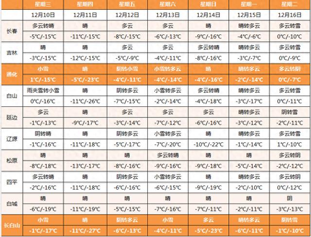 未来七天吉林省天气预报