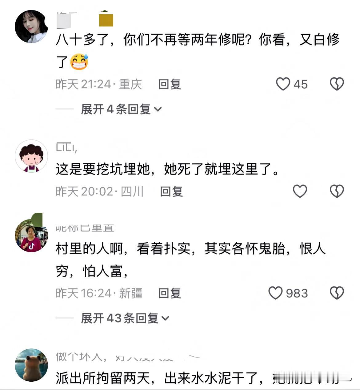 这干的什么事!湖南邵阳,一条刚修好的水泥路,被80岁老太太用锄头挖了个稀巴烂!村民集体凑钱、出力,好不容易把泥巴路修成水泥路,本来是件全村拍手称快的好事。结果水泥还没干,老太太拿着锄头干了3小时,把整条路挖成了废品! 理由更让人无语:“占了我家的地!”可实际情况是——那根本不是她家的地,公家的路,还特地给她家留了两米! 修路负责人老李急得直跺脚,报警四次都没用,民警一走老太太继续挖。 针对这个事我认为: 第一,老太太的行为已经不是“糊涂”,而是公然破坏公共利益。公共设施不是谁家的私产,是全村人的路。 第二,执法不能因为老人就束手束脚。只要是违法,就应该有法律后果。年纪大不是无限豁免券。 第三,这背后多半不是老人一个人的主意,怂恿她的人,也该承担责任。 一个村庄想发展,需要大家往一处使劲;但只要有一个人往回拽,全村都得陪着倒霉。 你怎么看?欢迎留下你的观点。 (信息来源:四川日报)