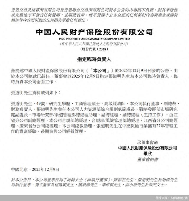 北京商报讯(记者李秀梅)12月9日,中国人民财产保险股份有限公司(以下简称“人保财险”)公告:由于公司总裁已辞任,董事会于2025年12月9日指定张道明为公司临时负责人,临时负责公司全面工作。