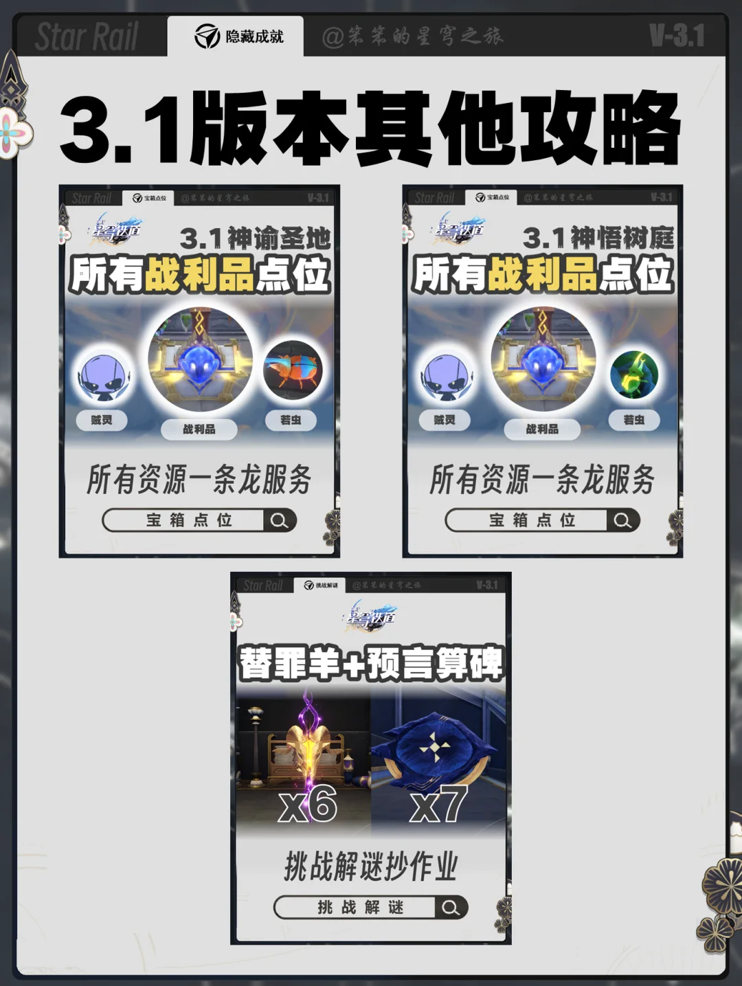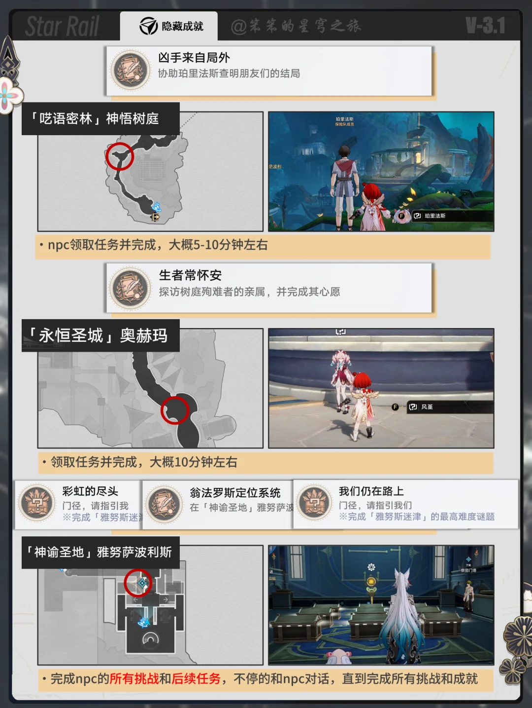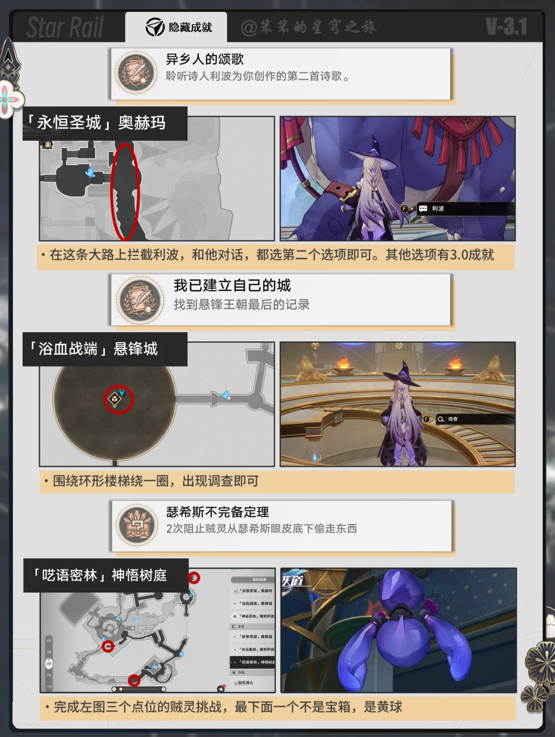 🐱大家好,我是笨笨的铲屎官 今天给大家带来的3.1隐藏成就 包含了大部分成就 剩余未标注的成就,要不就是直接主线必拿 要不就是比较复杂,一张图放不下的 希望对你有用哦