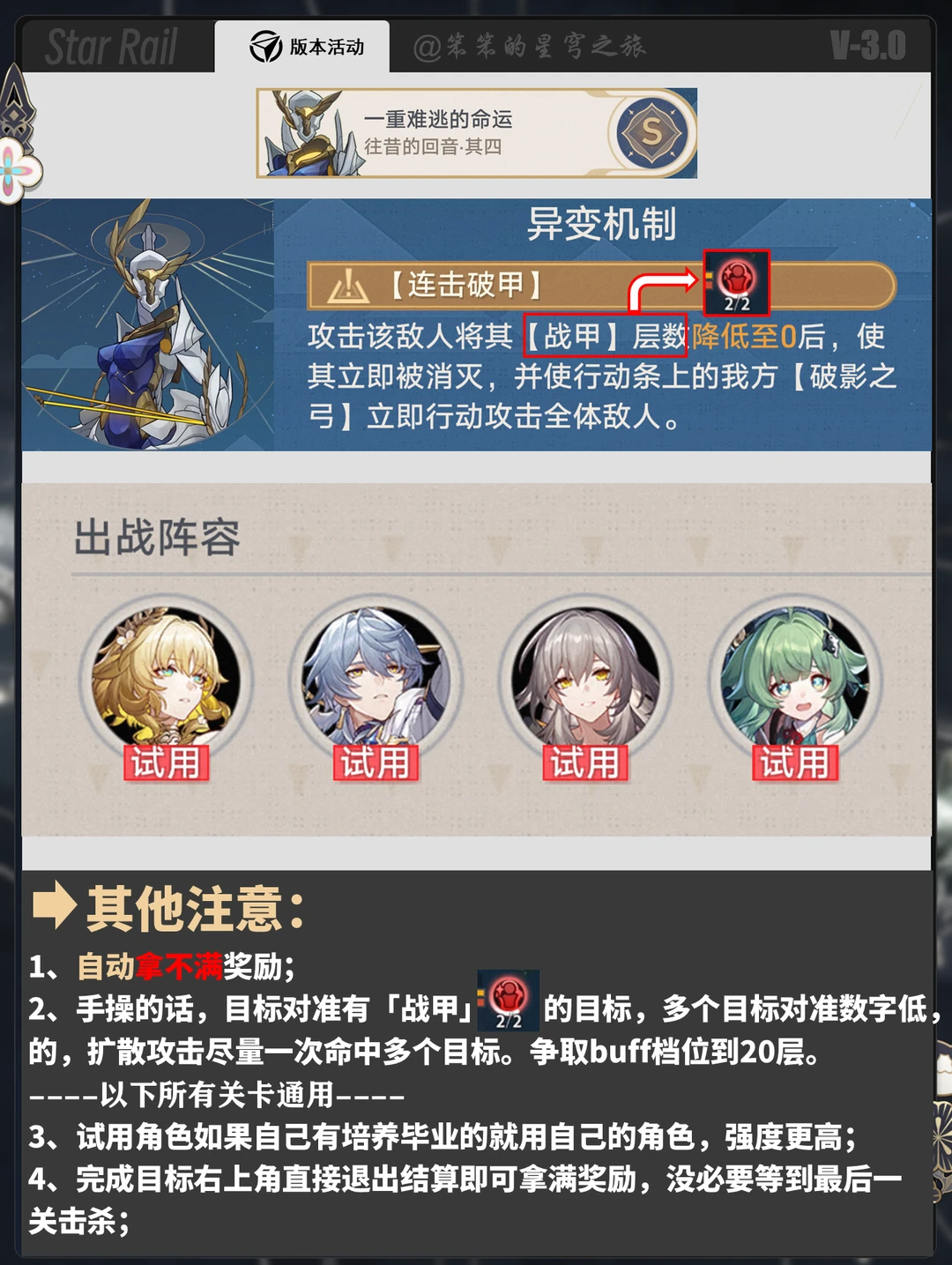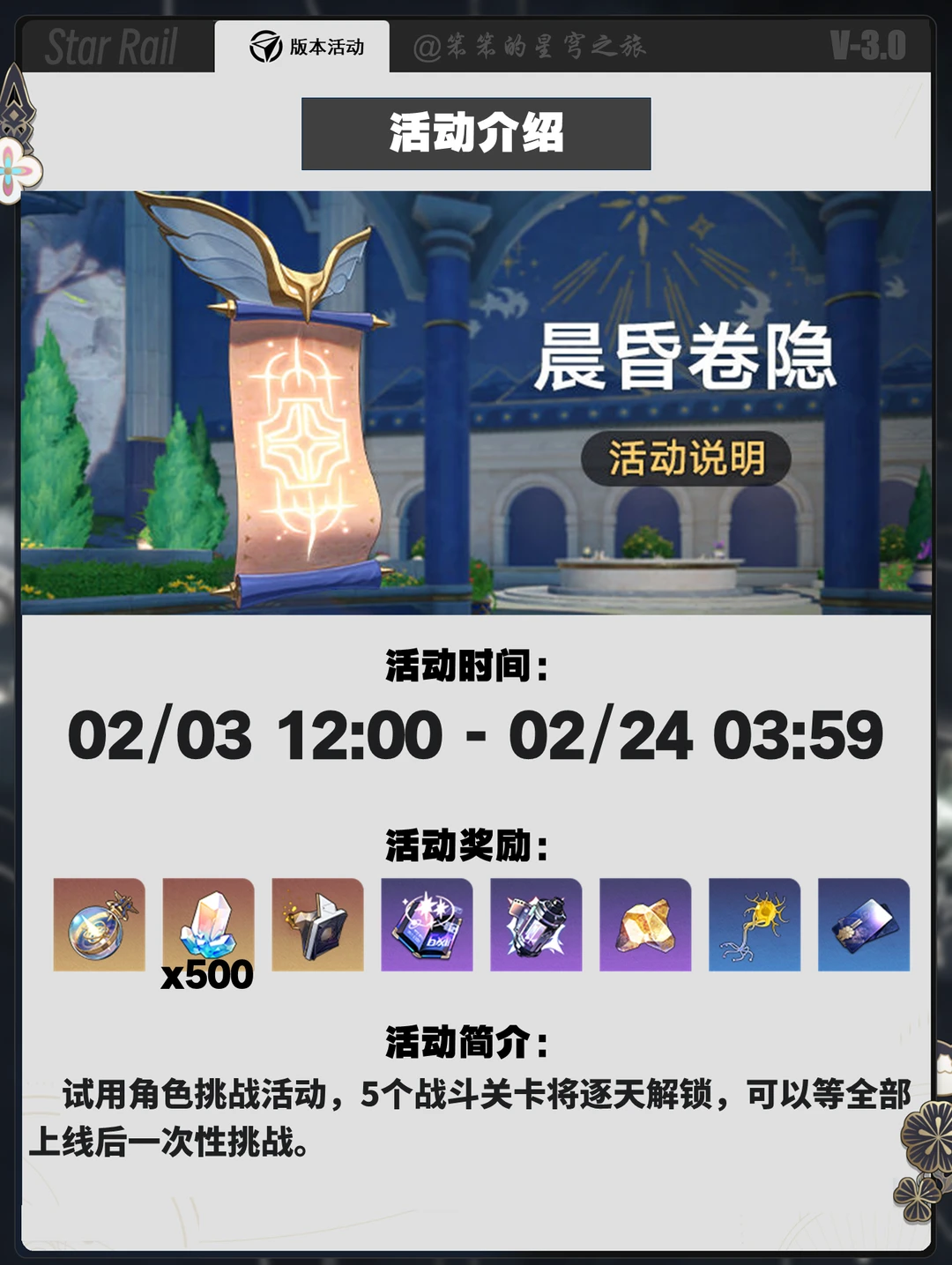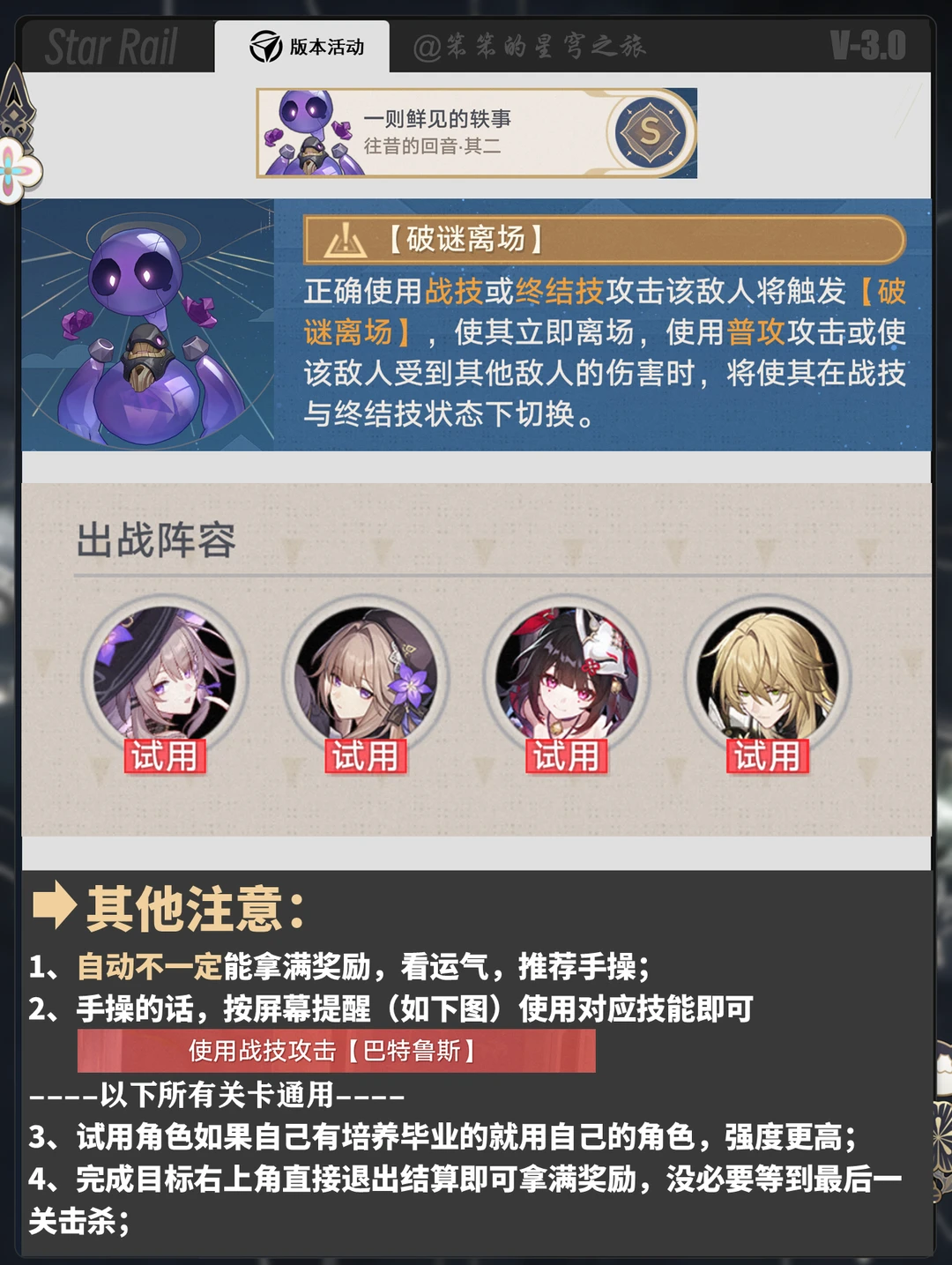🐱大家好,我是笨笨的铲屎官 崩铁3.0最后一个小活动上线啦 试用角色挑战活动,分5天上线 整体还是比较简单的 大家可以等活动全部上线后一次性拿满奖励哦
