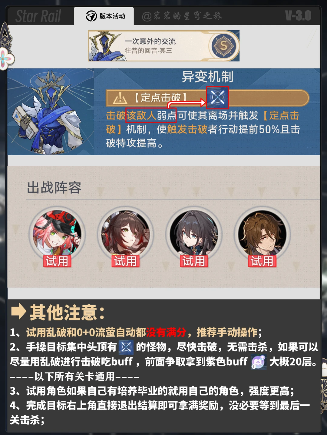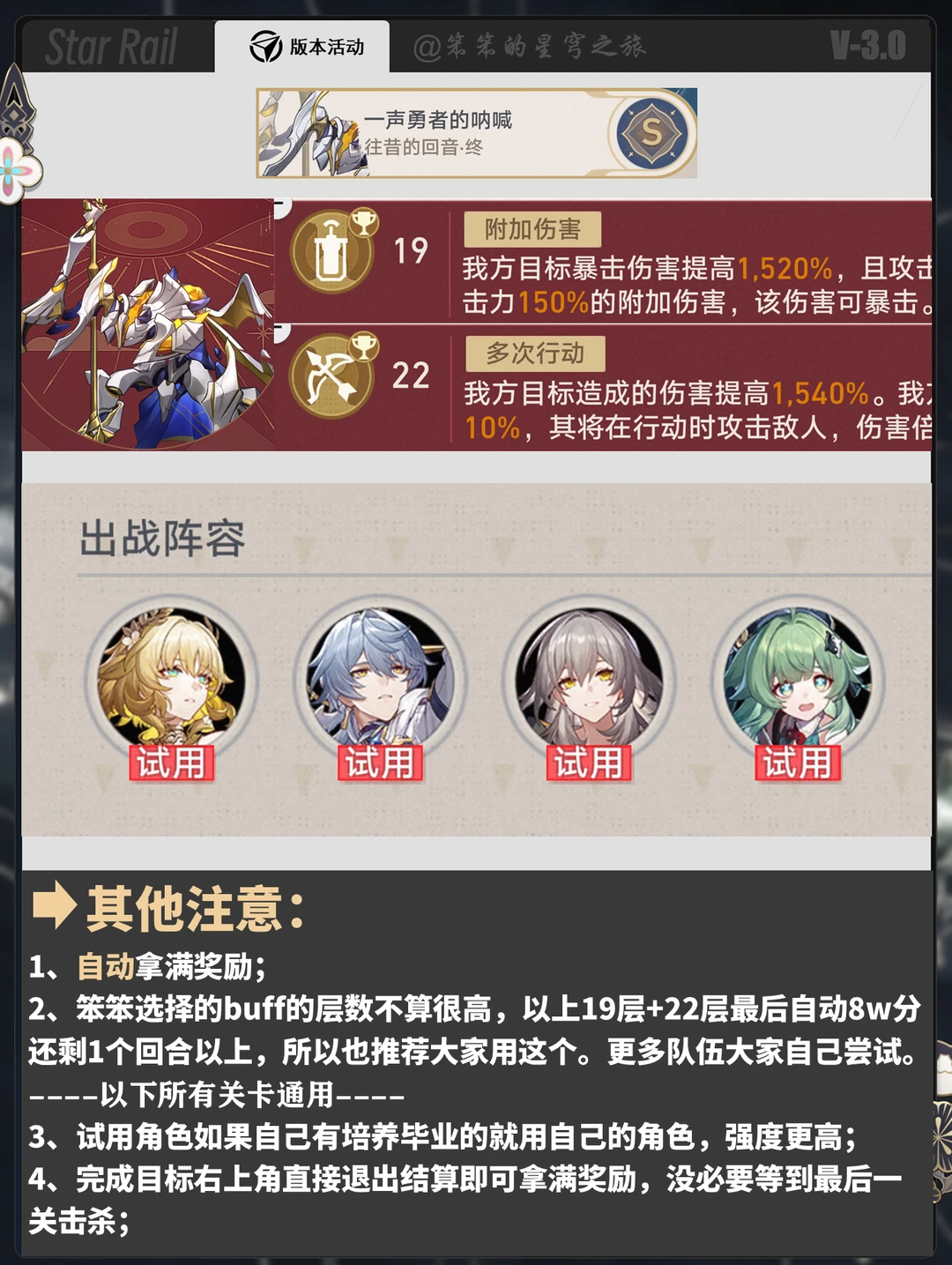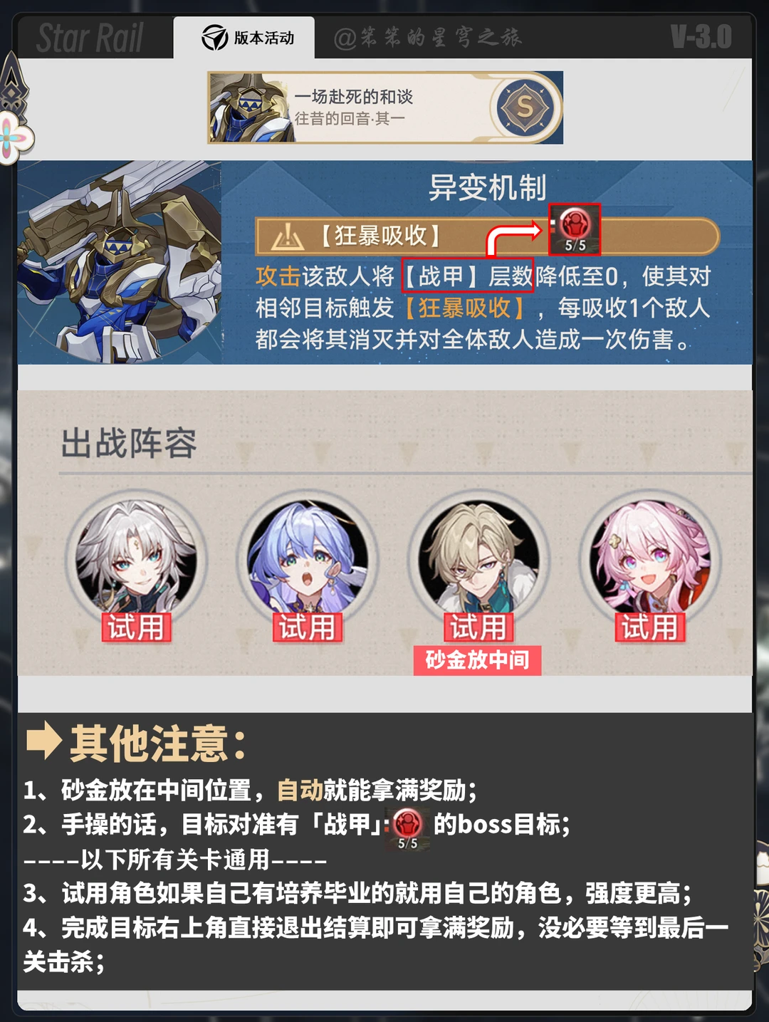 🐱大家好,我是笨笨的铲屎官 崩铁3.0最后一个小活动上线啦 试用角色挑战活动,分5天上线 整体还是比较简单的 大家可以等活动全部上线后一次性拿满奖励哦