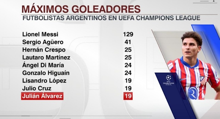 直播吧12月10日讯在本轮欧冠马竞3-2击败埃因霍温的比赛中,阿尔瓦雷斯破门。这也是他在欧冠第19球,以下为阿根廷球员在欧冠射手榜: