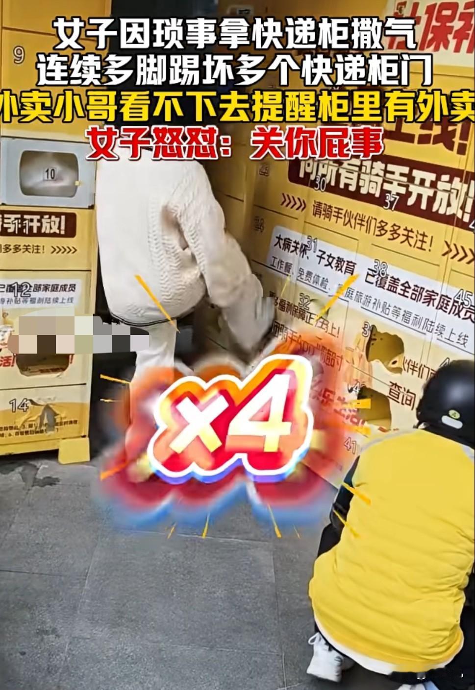 又是一个“小仙女”!广西,一女子对着快递柜狂踹,旁边外卖小哥实在看不过去,小心提醒一句:“里面有外卖,别踢坏了……”结果下一秒发生的事把所有人都整懵了! 她不是被偷了快递,也不是遇到坏人,就是情绪上头,对着柜门一脚一脚死命踹。 外卖小哥好心提醒里面有外卖,女子却突然转头,对着小哥怒吼:“关你屁事!那一腿踢在柜门上,这一句骂在所有好心人心里。 我觉得,你就是情绪再差,不是你为所欲为的理由。公共设施不是你的出气筒,更不是你对好心人撒气的借口。 你踢坏的不是柜门,你砸碎的是他人对善意的最后一点勇气。外卖小哥被吼一次,以后可能再也不敢提醒,不敢多说。 社会的冷漠,就是被这种人,一点点制造出来的。 你觉得呢?这种把坏情绪甩向无辜路人的行为,到底该不该严管? (信息来源:中安新闻)