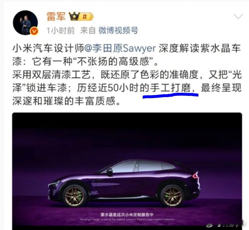 宣传里面,是50小时的涂装和手工打磨。但雷老板的微博里,变成了50小时的手工打磨。让我想起之前的,评测方说“准-冬季评测”,雷老板微博说“冬季评测”,这都是文字的毫厘之差,在宣传上就截然不同。也许雷老板觉得为了宣传效果更好,可能有一点偏差没啥。但现在“黑子”这么多,雷军代表着小米的形象,还是要注意下个人的言语啊。之前不是都有法务“抱怨”,雷军发在自媒体的话不能作为法律审判的依据…………这样弄,真的非常容易招黑的。小米汽车