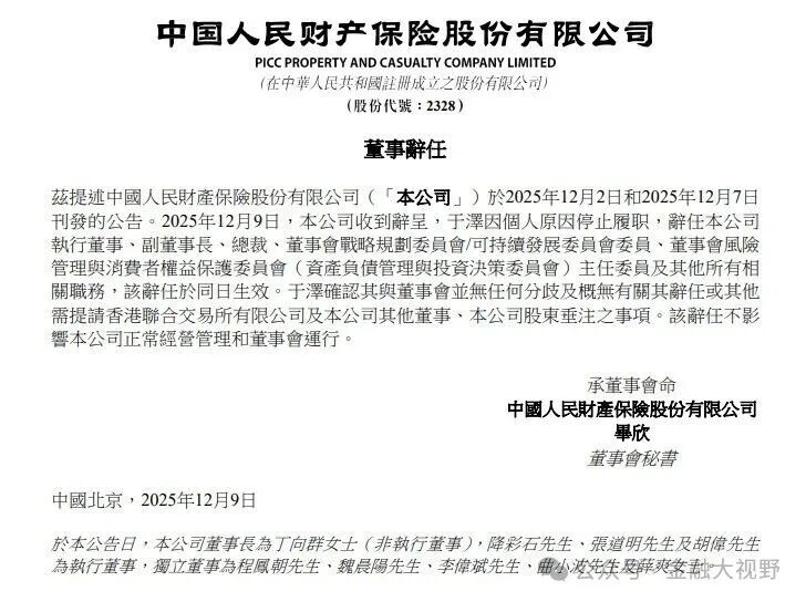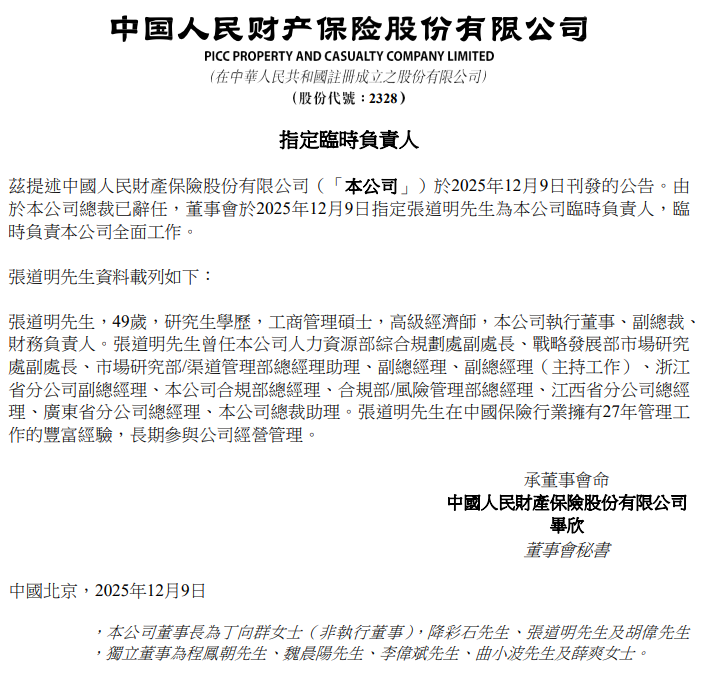 12月9日,人保财险发布公告称,由于公司总裁已辞任,董事会于2025年12月9日指定张道明为公司临时负责人,临时负责公司全面工作。